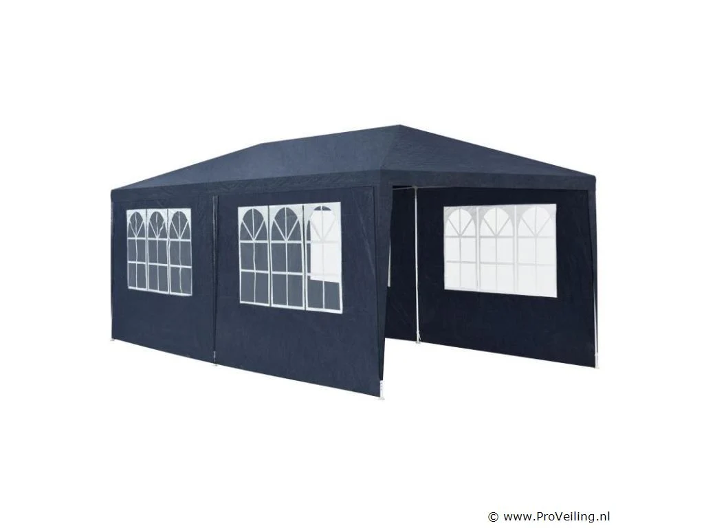 De partytent van 3 x 6 m (blauw) is de perfecte zonwering voor allerlei buitenevenementen Of het nu gaat om een ??barbecue, een verjaardag of een bruiloft - het praktische paviljoen nodigt uit om samen te zitten en feest te vieren met familie en vrienden. Onder de feesttent zijn u en uw gasten goed beschermd tegen de brandende zon. 's Avonds dienen de uitneembare zijpanelen als extra bescherming tegen koele tocht en muggen. Optimale voorwaarden om speciale gelegenheden uitgebreid te vieren in eigen tuin of op het terras. Technische specificaties: Materiaal frame: staal, gepoedercoat (100%) Materiaal dak: 100 g/m² polyethyleen (100%) Materiaal zijdelen: 90 g/m² polyethyleen (100%) Kleur tuintent: blauw Zijwand met raam: 4 Zijpaneel met ritssluiting: 2 Aantal voeten: 6 Aantal bevestigingstouwen: 6 Aantal grondpennen: 12 Afmetingen (ongeveer): Breedte: 300cm Diepte: 600 cm Hoogte: 250cm Paaldak: Ø 1,8 cm Plaatbodem: Ø 2,4 cm Leveringsomvang: 1 × feesttent 1 × montage-instructies tips: LET OP: Het tuinpaviljoen biedt onvoldoende bescherming bij storm of slecht weer. Niet gebruiken tijdens onweer, sterke windstoten, zware regenval of hagel. Het paviljoen is niet ontworpen voor dit weertype. Alleen geschikt voor privégebruik. Zet de partytent veilig op een vlakke, droge en stevige ondergrond. Houd de minimale afstand van 3 m tot de volgende tent aan. Het is niet mogelijk om 2 tenten aan elkaar te koppelen.