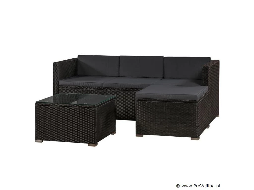 Ben je op zoek naar een comfortabele en grote loungeset voor in je tuin, terras of balkon? Met de zitset "Punta Cana L" verander je je buitenruimte in een stijlvolle plek om te ontspannen en je goed te voelen. Gezellige avonden met familie, vrienden of buren worden een belevenis in de buitenlucht. De unieke rotan look in zwart met grijze vulling geeft je nieuwe loungemeubel een moderne charme. Creëer je eigen oase van welzijn om te ontspannen en samen te zitten. Technische specificaties: Materiaal: Weefsel: polyrotan vezels Basis: staal Tafelblad: glas Hoezen: schuim, polyester Kleur: Vlecht: zwart Tafelblad: helder Kussenslopen: donkergrijs Afmetingen (ongeveer): Tafel: 61 × 61 × 37 cm (L x B x H) Hoekbank: 178 × 69 × 65 cm (L x B x H) Fauteuil: 70 × 69 × 65 cm (L x B x H) Kruk: 61 × 61 × 37 cm (L x B x H) Dikte zitkussen: 5 cm Dikte glasplaat: 0,5 cm Breedte rugkussen: 54 cm Zitkruk: 60 × 60 cm Leveringsomvang: 1x tafel 1 x hoekbank 1 x fauteuil 1 x kruk 5 x zitkussens 4 x rugkussens 1 x montage-instructies Let op: U ontvangt het product goed verpakt als bouwpakket voor zelfmontage per pakketdienst. Dit artikel bestaat uit 2 dozen, het kan logistiek voorkomen dat het in meerdere dagen geleverd wordt.