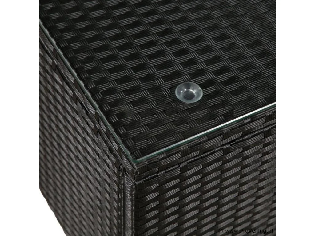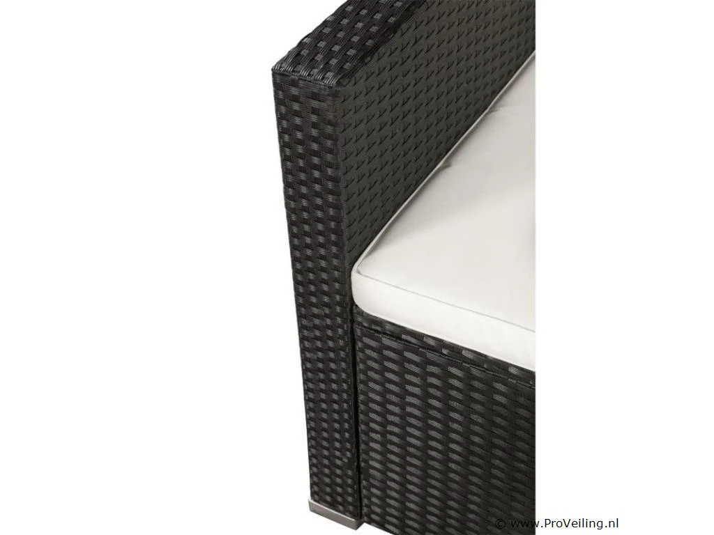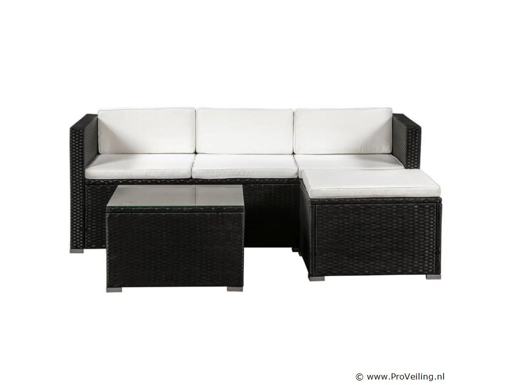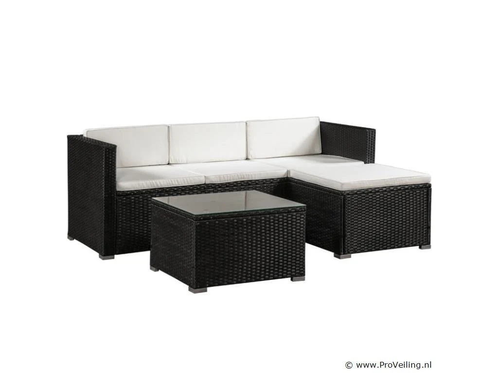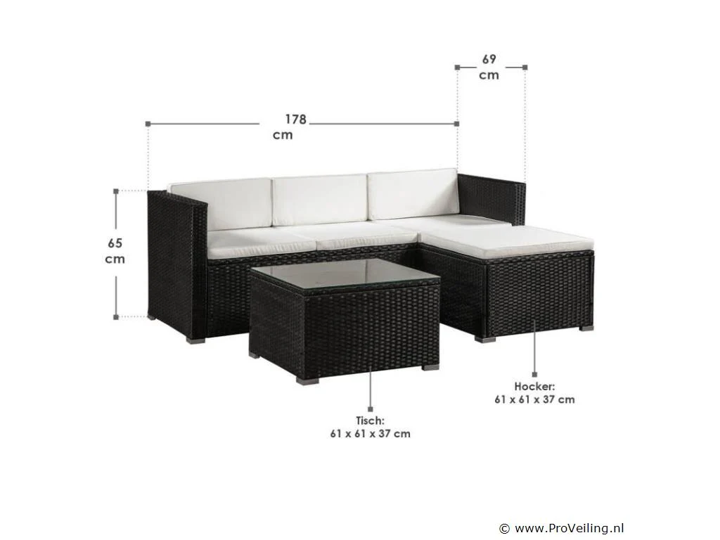Ben je op zoek naar een comfortabele en grote loungeset voor in je tuin, terras of balkon? Met de zitgroep "Punta Cana M" verander je je buitenruimte in een stijlvolle plek om te ontspannen en je goed te voelen. Gezellige avonden met familie, vrienden of buren worden een geweldige belevenis in de buitenlucht. De unieke rotan-look in zwart met beige kussens geeft je nieuwe loungemeubel een moderne charme. Creëer je eigen oase van welzijn om te ontspannen en samen te zitten. Technische specificaties: Materiaal: Weefsel: vezels van polyrotan Onderstel: staal Tafelblad: glas Hoezen: schuim, polyester Kleur: Vlecht: zwart Tafelblad: helder Kussenslopen: gebroken wit Afmetingen (ongeveer): Tafel: 61 × 61 × 37 cm (L x B x H) Bank: 178 × 69 × 65 cm (L x B x H) Kruk: 61 × 61 × 37 cm (L x B x H) Dikte zitkussen: 5 cm Dikte glasplaat: 0,5 cm Breedte rugkussen: 54 cm Zitkruk: 60 × 60 cm Leveringsomvang: 1x tafel 1 x Bank 1 x kruk 4 x zitkussens 3 x rugkussens 1 x montagehandleiding