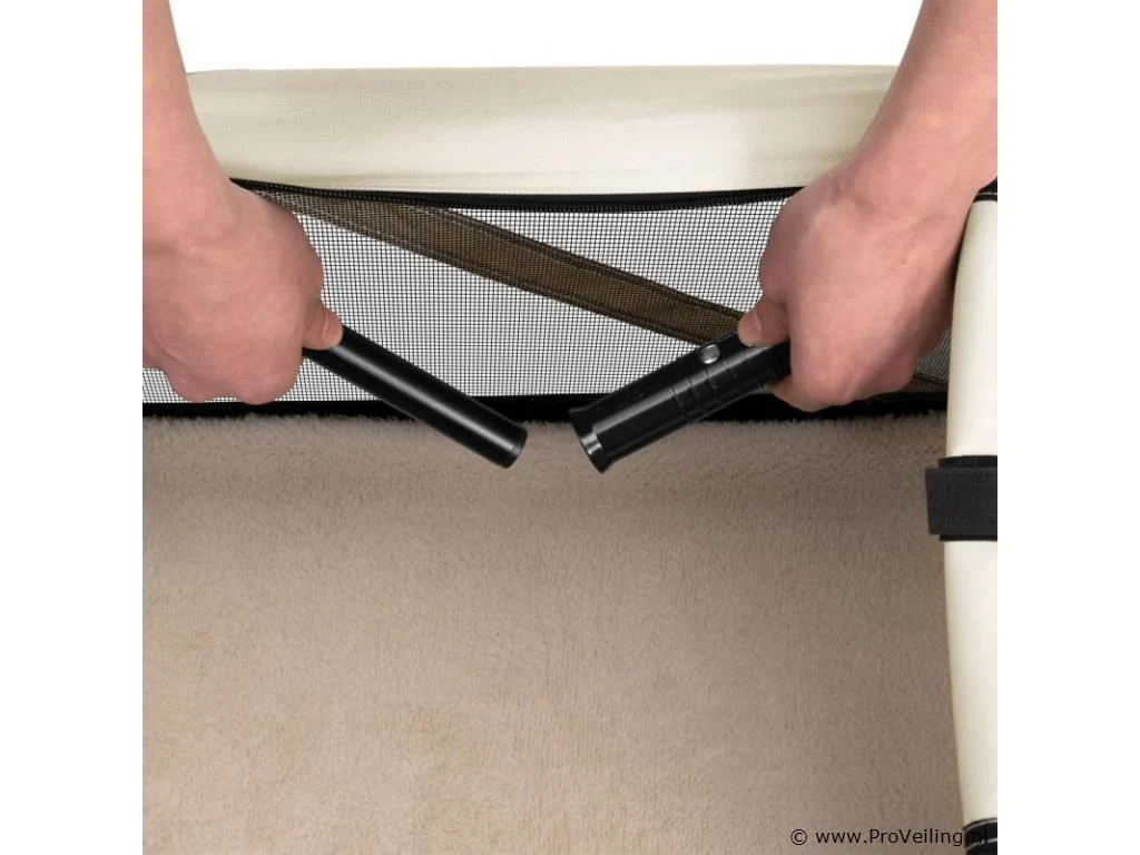 Hondendromen komen uit met de opvouwbare hondentransportbox Lassie (maat M, beige) van stof. De grote box is geschikt voor puppy's en kleine hondenrassen tot 40 cm groot, zoals mopshonden, teckels, miniatuurpoedels of Jack Russel Terriers. Je lieveling heeft genoeg ruimte om te liggen, staan ??en draaien. Toch komt hij heerlijk tot rust in zijn eigen oase van welzijn en kan hij lekker wegkruipen in de donzige deken. Dankzij de grote mesh-inzetstukken hebben de minibontneuzen goed zicht en frisse lucht. Handgrepen en een klein buitenvak ronden de omvangrijke uitrusting van de reiskoffer af. Technische specificaties: Materiaal: nylon, gaas, aluminium Kleur beige Maat M Geschikt voor: kleine honden Afmetingen (ongeveer): Breedte: 42cm Lengte: 60cm Hoogte: 44cm Leveringsomvang: 1 x opvouwbare hondendrager 1 x Instructie