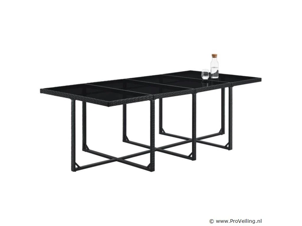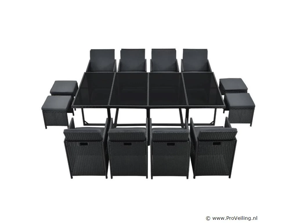 Lange, warme zomeravonden bieden de perfecte gelegenheid voor een samenzijn met vrienden of familie. Onze grote 13-delige tuinset biedt plaats aan maximaal 12 personen en overtuigt tegelijkertijd door zijn verbazingwekkend ruimtebesparende opbergtechniek als kubus. De grote polyrotan zitgroep in effen zwart en grijs ziet er modern uit en past perfect in je tuin of op je terras. De buitenzitgroep kan optimaal worden gebruikt als eettafel en als lounge om te ontspannen. Technische specificaties: Materiaal kussen: foam, stof Materiaal gaas: polyrotan Materiaal onderstel: staal Materiaal tafelblad: glas Aantal personen: 12 Kleur polyrotan: zwart Kleur stof: donkergrijs Kleur glas: zwart getint Kussenslopen: afneembaar & wasbaar Afmetingen (ongeveer): Afmetingen tafelblad: 225 x 109 cm Tafelhoogte: 74 cm Zitkruk: 41 x 41 cm Zithoogte kruk (met kussen): 40 cm Zithoogte kruk (zonder kussen): 36 cm Zitting stoel: 40 x 47 cm Zithoogte stoel (met kussen): 48 cm Zithoogte stoel (zonder kussen): 44 cm Rugleuning stoel: 40 cm Dikte zitkussen: 4 cm Leveringsomvang: 1x tafel 8 x stoelen 4 x krukken 12 x zitkussens 8 x rugkussens 1 x Instructie
