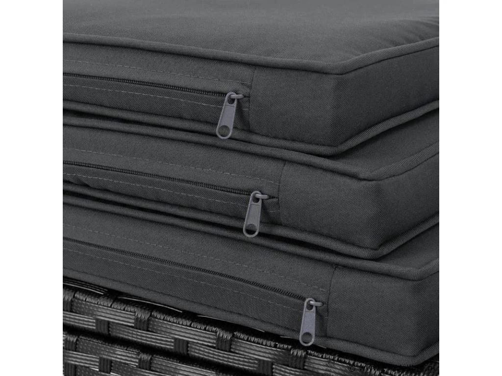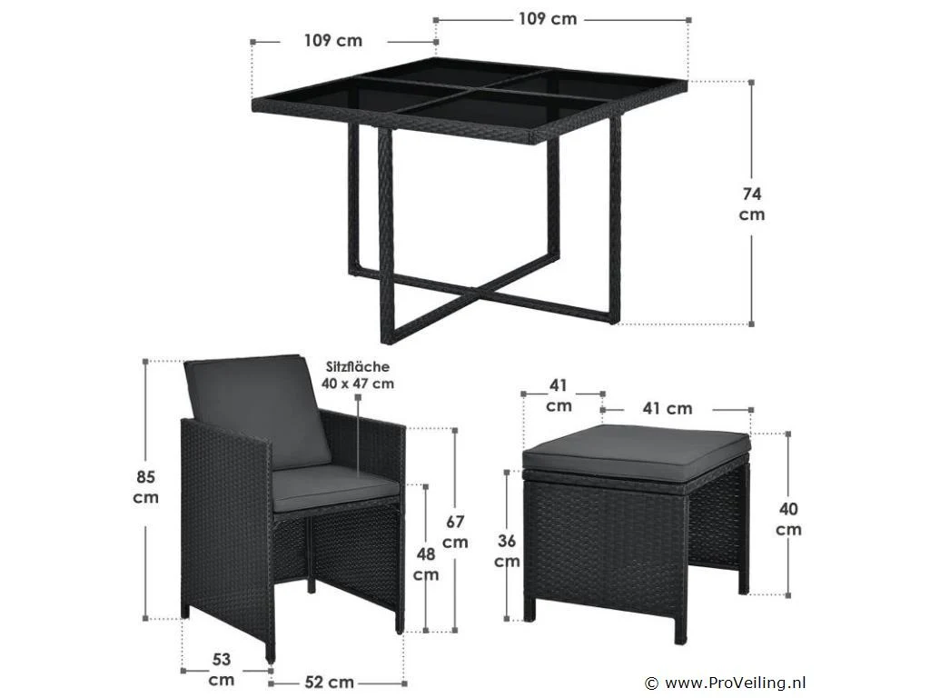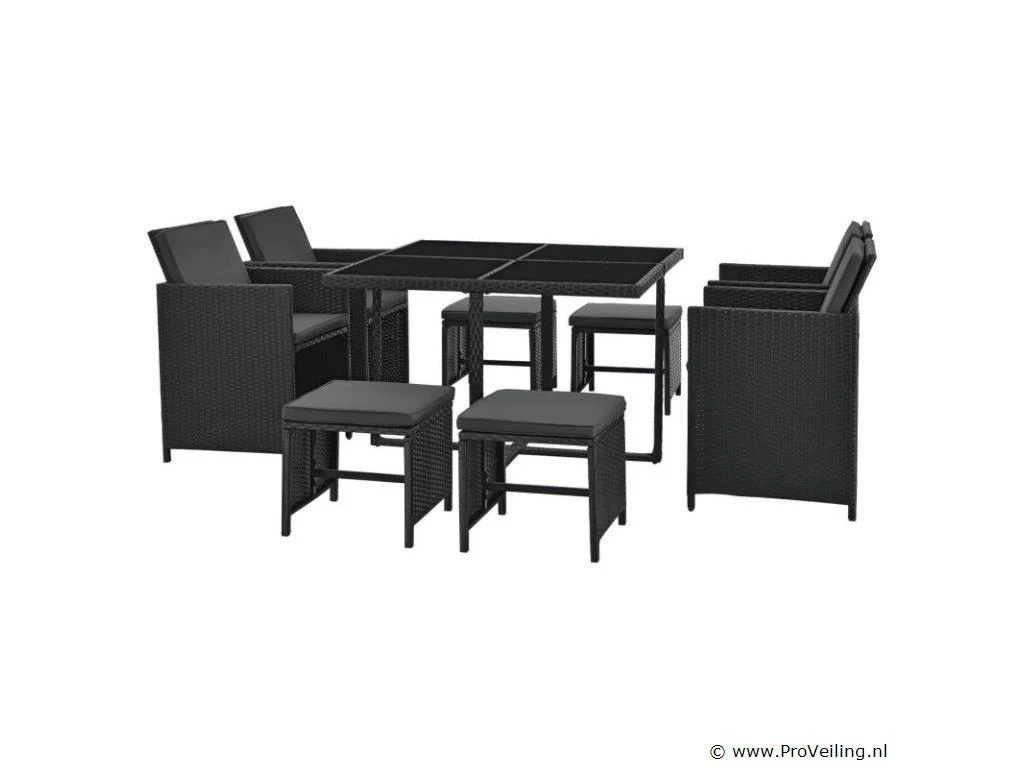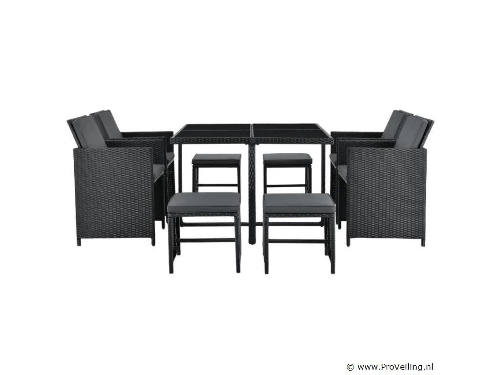 Lange, warme zomeravonden bieden de perfecte gelegenheid voor een samenzijn met vrienden of familie. Onze grote 9-delige tuinset biedt plaats aan maximaal 8 personen en overtuigt tegelijkertijd door zijn verbazingwekkend ruimtebesparende opbergtechniek als kubus. De grote polyrotan zitgroep in effen zwart en grijs ziet er modern uit en past perfect in je tuin of op je terras. De buitenzitgroep kan optimaal worden gebruikt als eettafel en als lounge om te ontspannen. Technische specificaties: Materiaal kussen: foam, stof Materiaal gaas: polyrotan Materiaal onderstel: staal Materiaal tafelblad: glas Aantal personen: 8 Kleur polyrotan: zwart Kleur stof: donkergrijs Kleur glas: zwart getint Kussenslopen: afneembaar & wasbaar Afmetingen (ongeveer): Afmetingen tafelblad: 109 x 109 cm Tafelhoogte: 74 cm Zitkruk: 41 x 41 cm Zithoogte kruk (met kussen): 40 cm Zithoogte kruk (zonder kussen): 36 cm Zitting stoel: 40 x 47 cm Zithoogte stoel (met kussen): 48 cm Zithoogte stoel (zonder kussen): 44 cm Rugleuning stoel: 40 cm Dikte zitkussen: 4 cm Leveringsomvang: 1x tafel 4 x stoelen 4 x krukken 8 x zitkussens 4 x rugkussens 1 x Instructie