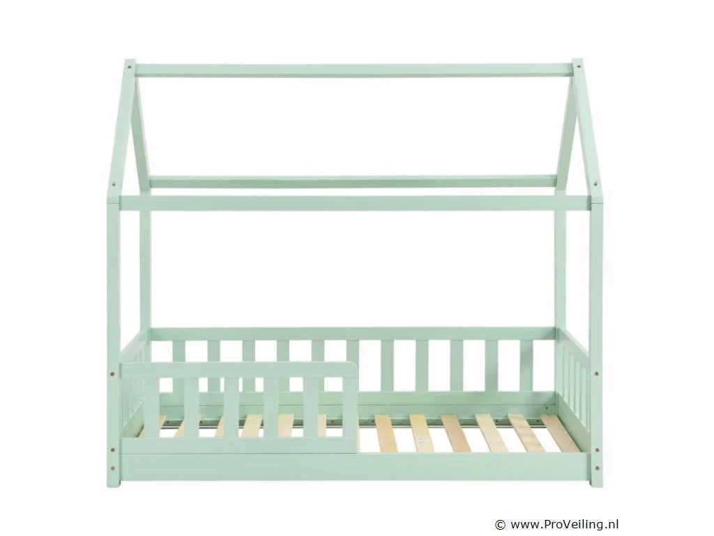 Het moderne kinderbed Marli (160x80 cm, mint) met valbeveiliging, lattenbodem en dak is ideaal voor meisjes en jongens van 3 tot 10 jaar. Als gezellige slaap- en speelplek verfraait het huisbed elke kinderkamer. Want de woninglook met open dak biedt veel mogelijkheden! Ontwerp het bed met baldakijndecoratie, als hol of avontuurlijk speelbed. Zeker voor jonge kinderen biedt een poortje meer bescherming en veiligheid. Het houten bed is de juiste keuze voor langdurig gebruik dankzij het stevige en onderhoudsvriendelijke grenenhout. Technische specificaties: Materiaal frame: grenen hout Materiaal lattenbodem: hout, 11 latten Kleur: mint Afmeting: 80x160cm Maximale belasting: 120 kg Matras: zonder Afmetingen (ongeveer): Totale afmetingen (BxLxH): 87 x 166 x 143 cm Ligoppervlak: 160x80 cm Leveringsomvang: 1 × kinderbed 1 × lattenbodem 1 × dak 1 × Montage-instructies