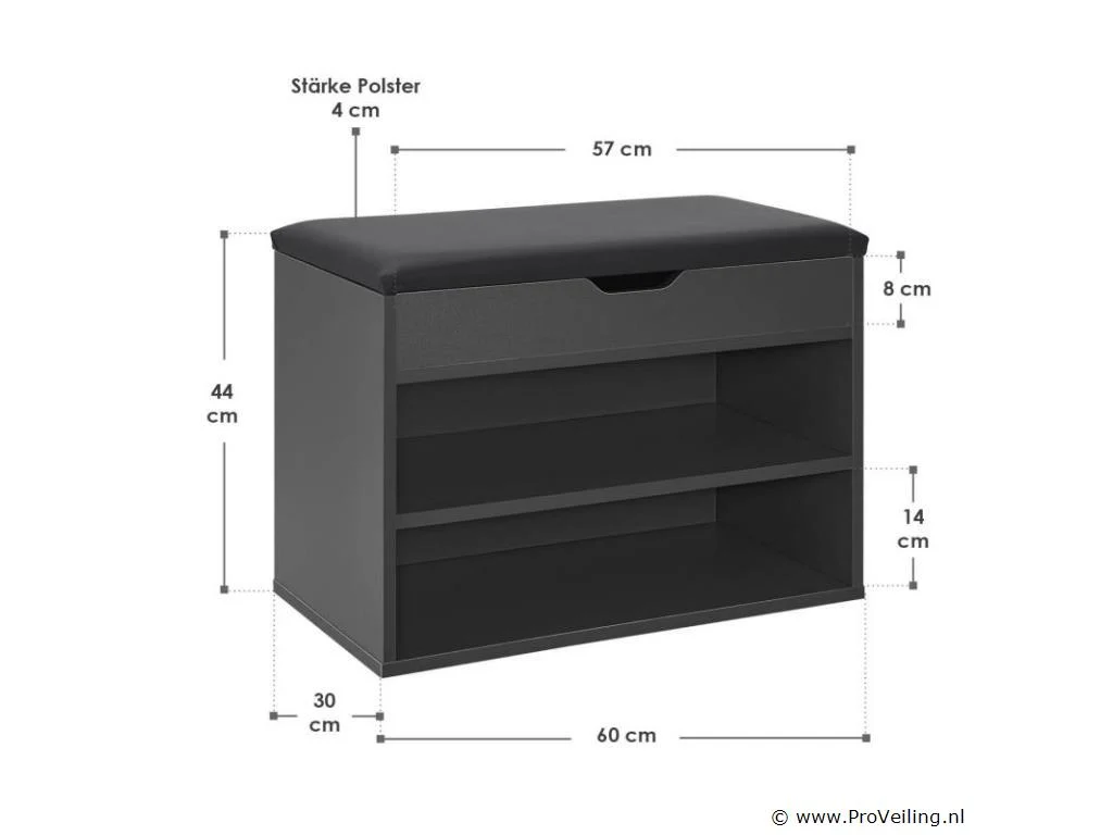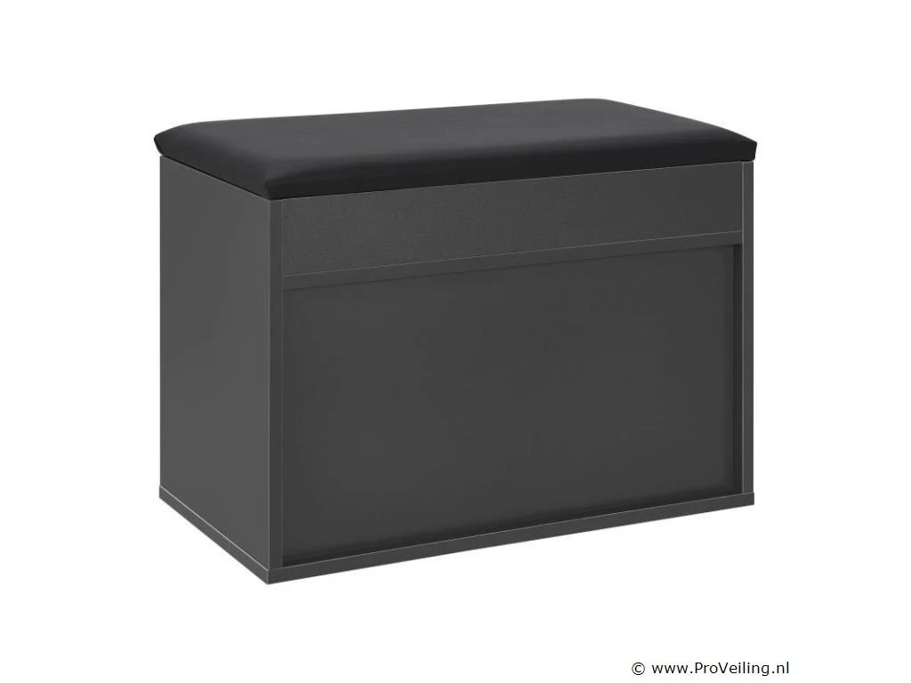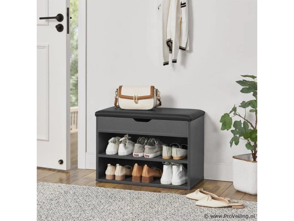Het kleine schoenenrek blijkt een echt wonder van opbergruimte te zijn. De twee schoenenrekken bieden gemakkelijk plaats aan maximaal 6 paar schoenen. Bovendien is er een ruim vak verborgen onder het gevoerde deksel, waarin kleine voorwerpen zoals schoenlepels of schoenborstels een nieuw, onopvallend thuis vinden - binnen handbereik en netjes opgeborgen. De zachte bekleding doet tevens dienst als comfortabele zitplaats. Met een draagvermogen tot 150 kg zit je hier comfortabel om je schoenen aan en uit te trekken, schoon te maken en dergelijke. De plank is gemaakt van lichte en robuuste houten panelen met een slijtvaste melamine coating. Technische specificaties: Lichaamsmateriaal: spaanplaat E1 (melaminecoating) Materiaal achterwand: MDF-plaat Materiaal zitkussen: schuim, kunstleer (polyurethaan) Carrosseriekleur: grijs Kleur bekleding: zwart Maximaal draagvermogen: 150 kg Afwerking: Mat Afmetingen (ongeveer): Totale afmetingen (LxBxH): 60x30x44 cm Afmeting 1 vak: 57x27x8 cm Afmeting 2 vakken: 57x27x14 cm Paddikte: 4 cm Materiaaldikte: 15 mm Dikte achterwand: 3 mm Leveringsomvang: 1 × schoenenrek 1 × montage-instructies