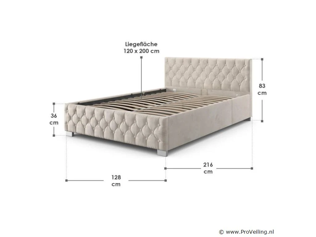 Het gestoffeerde bed Nizza combineert stijlvol Chesterfield-stikwerk met moderne, indirecte ledverlichting. Dankzij de zachte vulling met fluwelen hoes dient het hoge hoofdeinde als comfortabele rugleuning. De verende lattenbodem en de grote bedstee maken het comfortabele slaapkamermeubilair compleet. Technische specificaties: Materiaal lijst: MDF-hout Materiaal bekleding: fluweel Kleur hoes: beige Kleur voetjes: zilver Lichtkleur: wit Draagvermogen: 250 kg Afmetingen (ongeveer): Afmetingen staand: 128x216 cm Hoogte hoofdeinde: 83 cm Hoogte bedframe: 36 cm Hoogte voeten: 6 cm Ligvlak: 120x200 cm Leveringsomvang: 1 × gestoffeerd bed 1 × lattenbodem 1 × Instructie