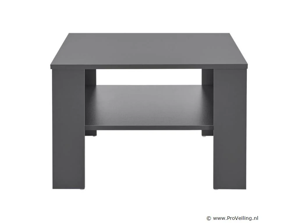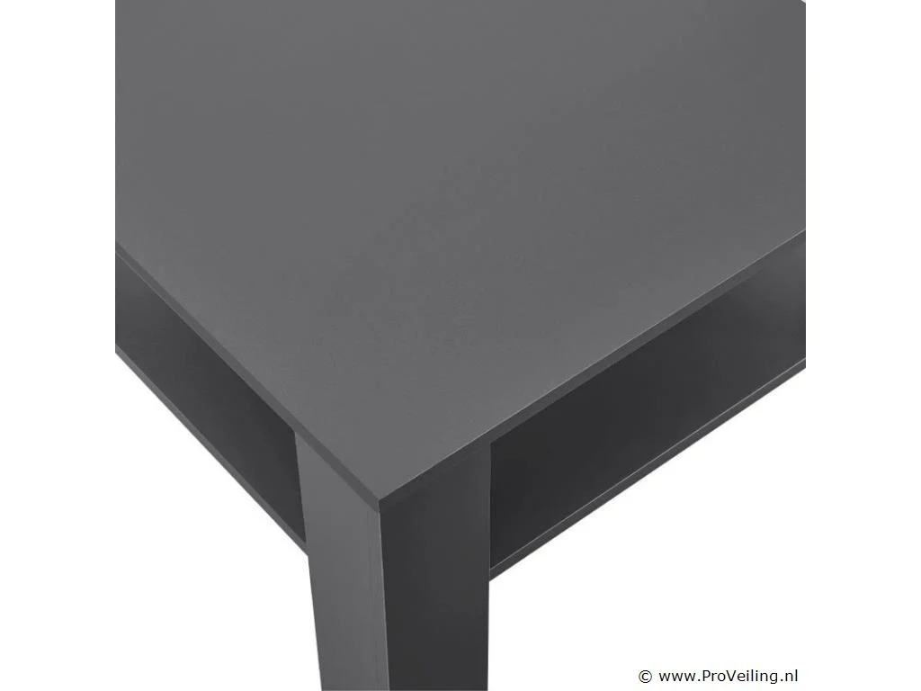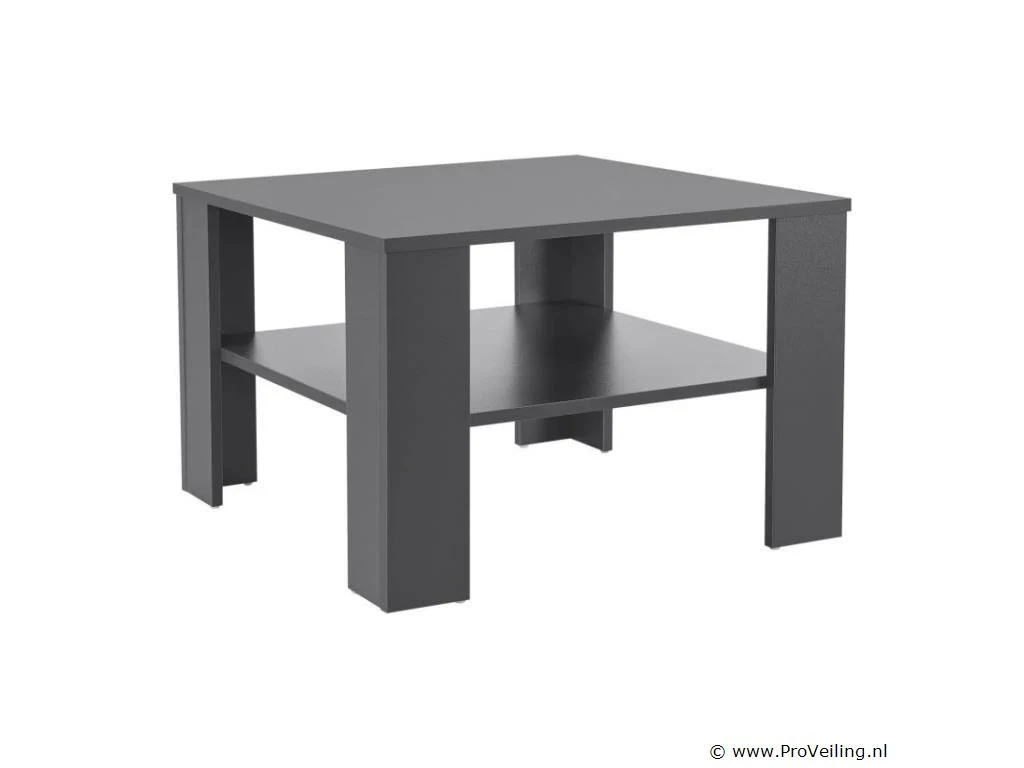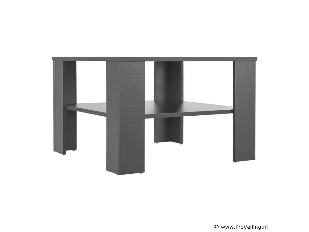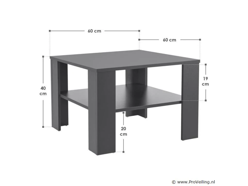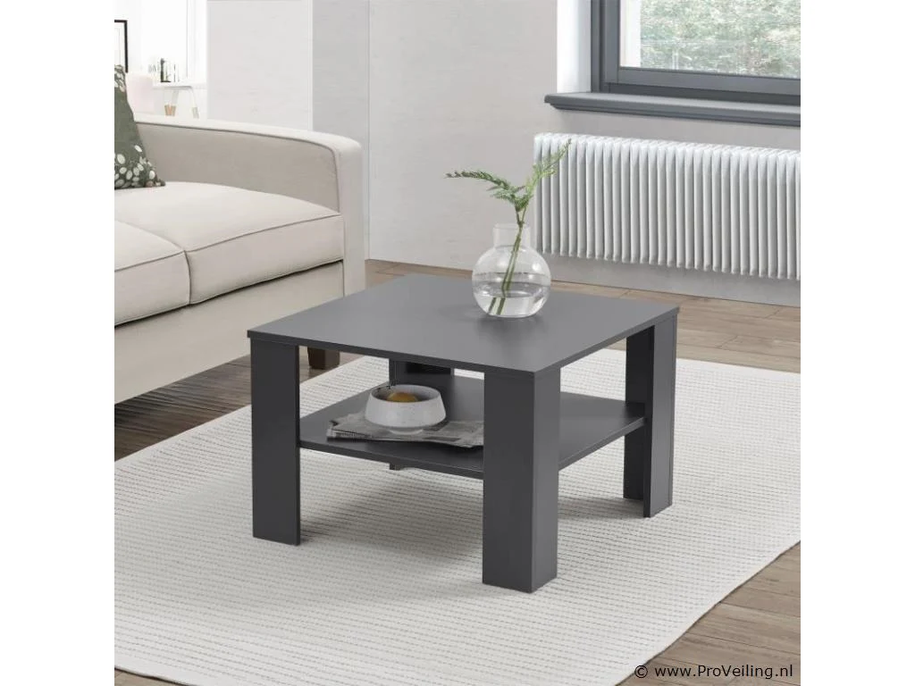 Met zijn compacte design en de eenvoudige, rechtlijnige look past de donkergrijze tafel perfect in bijna elke sfeer. De afmetingen van slechts 60 x 60 cm maken hem ideaal voor kleine ruimtes of als discrete bijzettafel. Op zijn 2 niveaus biedt hij verrassend veel ruimte voor drankjes, snacks, tijdschriften of afstandsbedieningen. De woonkamertafel is gemaakt van hout, wat hem niet alleen veerkrachtig en robuust maakt, maar ook licht van gewicht. Dankzij de melaminecoating zijn de oppervlakken ongevoelig voor krassen en zeer onderhoudsvriendelijk. Technische specificaties: Materiaal: spaanplaat E1 (melamine gecoat) Kleur: donkergrijs/houtlook Afwerking: Mat Maximale belasting: 50 kg Afmetingen (ongeveer): Totale afmetingen (LxBxH): 60x60x40 cm Afmeting vak: 57x57 cm Hoogte vak: 19 cm Materiaaldikte: 15 mm Bodemvrijheid: 20 cm Leveringsomvang: 1 × tafel 1 × montage-instructies