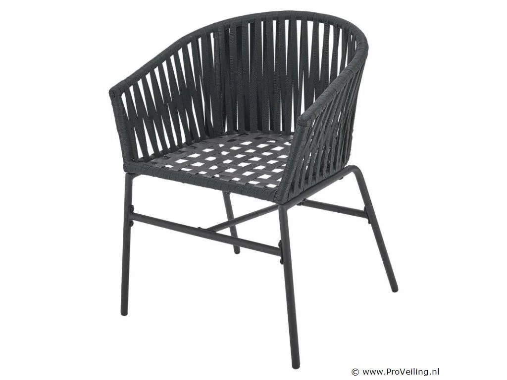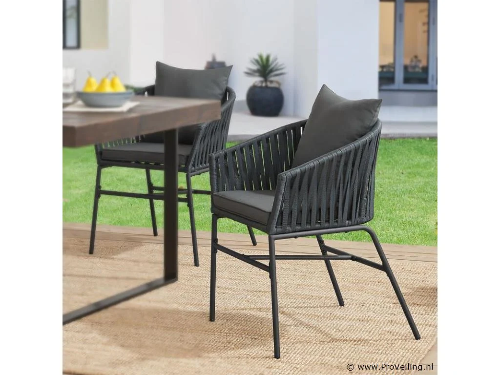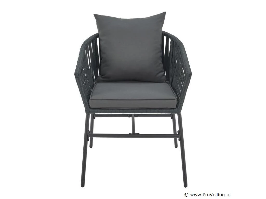 Stijlvol en elegant, met de 2 Rope stoelen zet u een bijzonder hoogtepunt op uw terras of balkon. Het touwgaas en de dikke bekleding zorgen voor een bijzonder zitcomfort. De constructie is uiterst robuust en dankzij de poedercoating corrosie- en krasbestendig. Technische specificaties: Materiaal frame: staal (gepoedercoat) Materiaal gaas: polypropyleen Materiaal bekleding: 100% polyester Kleur frame: zwart Vlechtkleur: donkergrijs Kleur bekleding: donkergrijs Maximale belasting: 160 kg Afmetingen (ongeveer): Totale afmetingen (LxBxH): 58x58x78 cm Zithoogte: 48 cm Dikte zitkussen: 5 cm Dikte rugkussen 12 cm Leveringsomvang: 2 x stoel 2 x zitkussens 2 x rugkussens 1 × montage-instructies