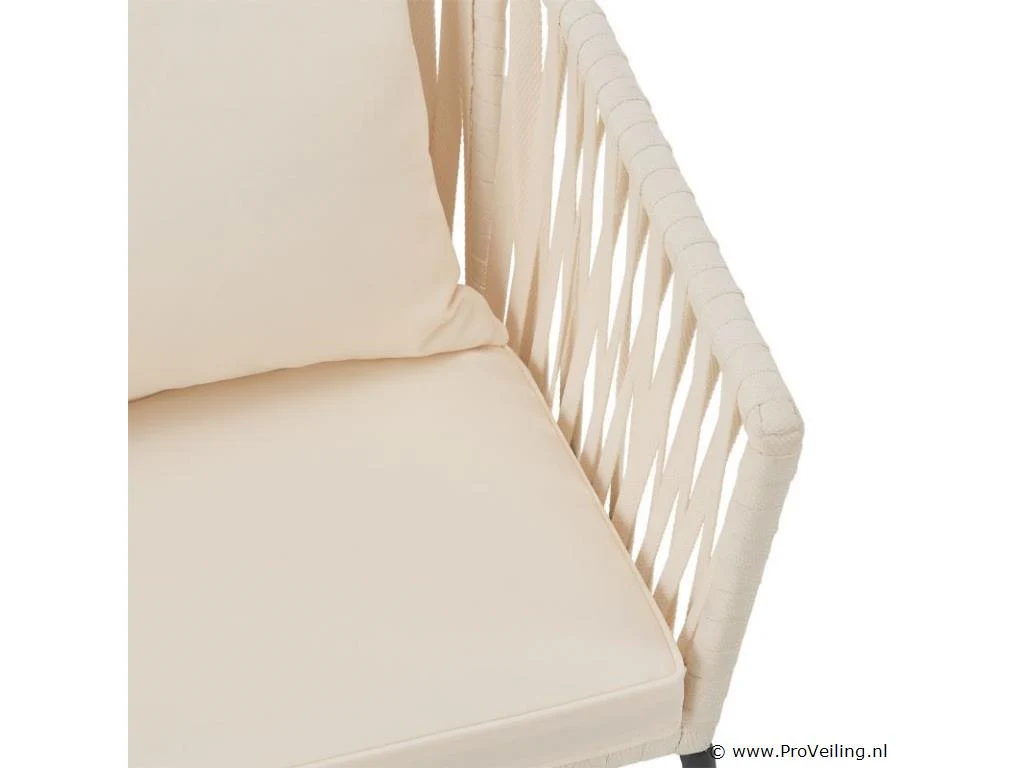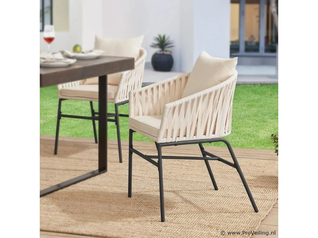 Stijlvol en elegant, met de 2 Rope stoelen zet u een bijzonder hoogtepunt op uw terras of balkon. Het touwgaas en de dikke bekleding zorgen voor een bijzonder zitcomfort. De constructie is uiterst robuust en dankzij de poedercoating corrosie- en krasbestendig. Technische specificaties: Materiaal frame: staal (gepoedercoat) Materiaal gaas: polypropyleen Materiaal bekleding: 100% polyester Kleur frame: zwart Vlechtkleur: Beige Kleur bekleding: Beige Maximale belasting: 160 kg Afmetingen (ongeveer): Totale afmetingen (LxBxH): 58x58x78 cm Zithoogte: 48 cm Dikte zitkussen: 5 cm Dikte rugkussen 12 cm Leveringsomvang: 2 x stoel 2 x zitkussens 2 x rugkussens 1 × montage-instructies