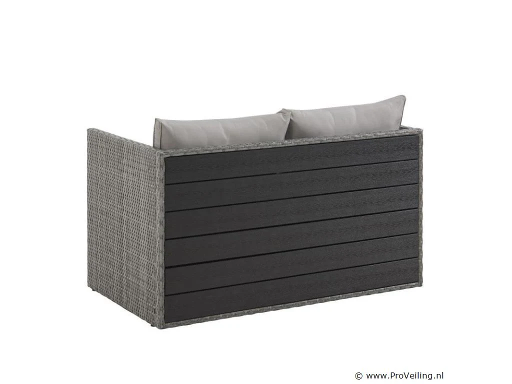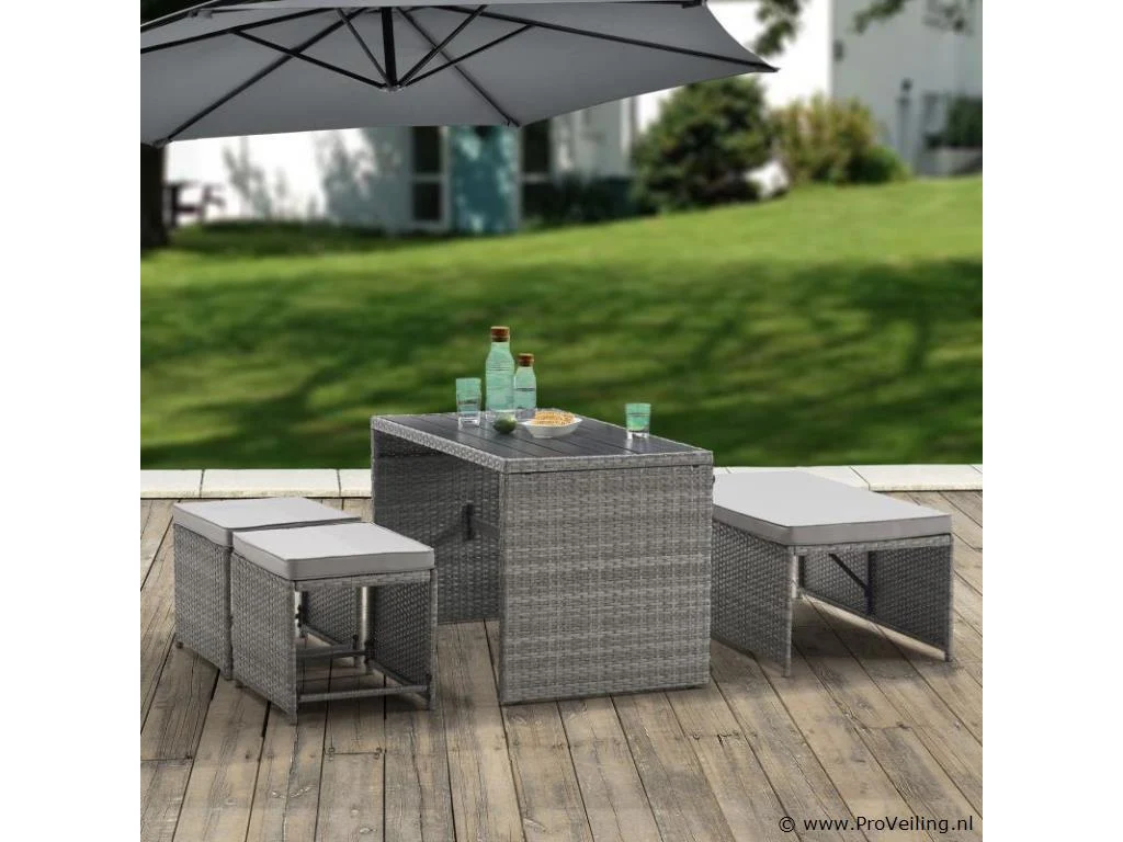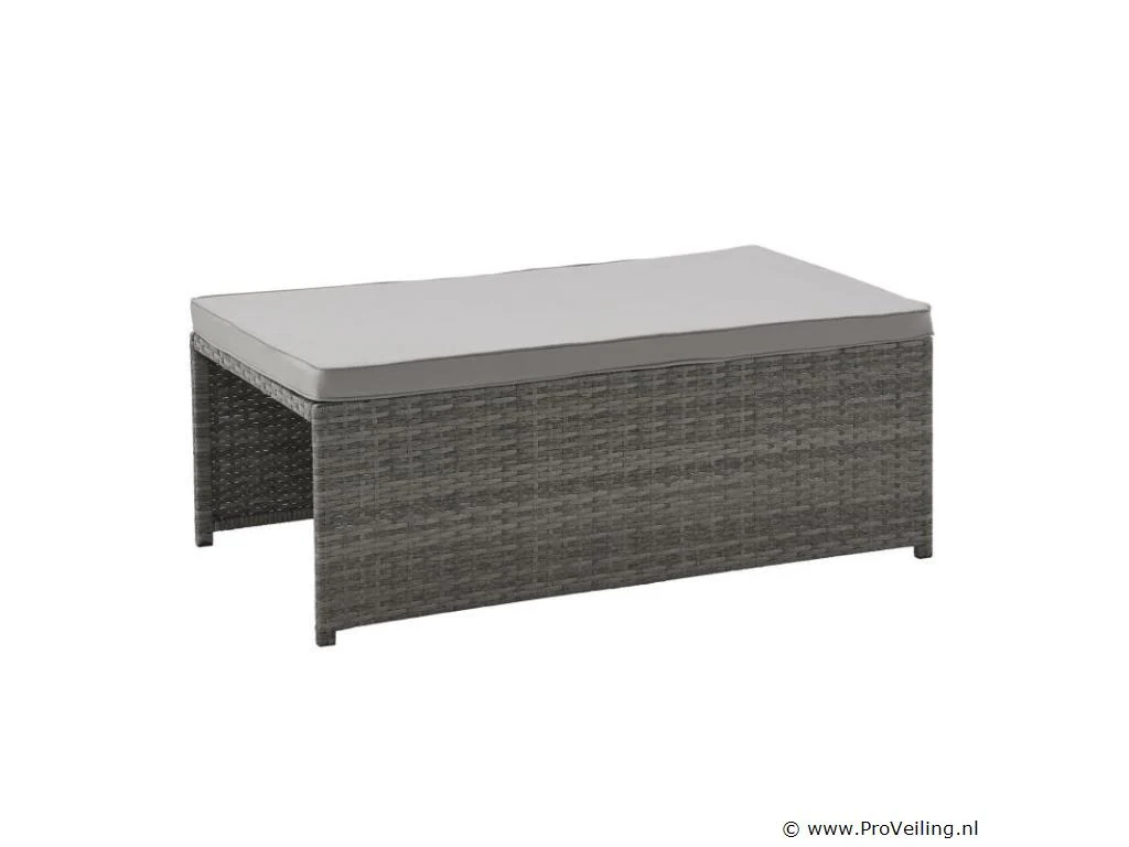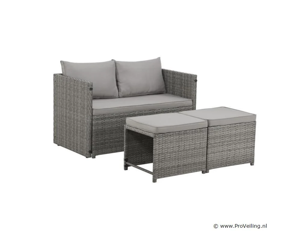 De 2in1 polyrotan Relax tuinmeubel Jamaica in grijs bestaat uit een tafel, bank en krukken. Gebruik de set als comfortabele bank of als zithoek met tafel. De bank doet ook dienst als bank en tafel als je de tafel 90 graden draait. De multifunctionele zitgroep voor 2 tot 4 personen is vooral geschikt waar weinig ruimte is, zoals voor een klein balkon, tuin of op de camping. De moderne lounge is gemaakt van polyrotan en is weerbestendig, onderhoudsvriendelijk en duurzaam. Technische specificaties: Materiaal gaas / frame: polyrotan / staal Materiaal hoes: 180 g/m² polyester Materiaal tafelblad: kunststof hout Kleur tuinlounge: Grijs (grijs gemêleerd) Kleur kussen: grijs (lichtgrijs) Aantal zitplaatsen: 2 tot 4 Hoezen wasbaar: ja Draagvermogen bank: 200 kg Draagvermogen per kruk: 100 kg Afmetingen (ongeveer): Tafel (LxBxH): 110x60x61 cm Bank (BxDxH): 102x57x35 Kruk (BxDxH): 40x40x35 Dikke kussens: 6 cm Leveringsomvang: 1x tafel 1 x Bank 2 x krukken 5 x kussens 1 x Instructie