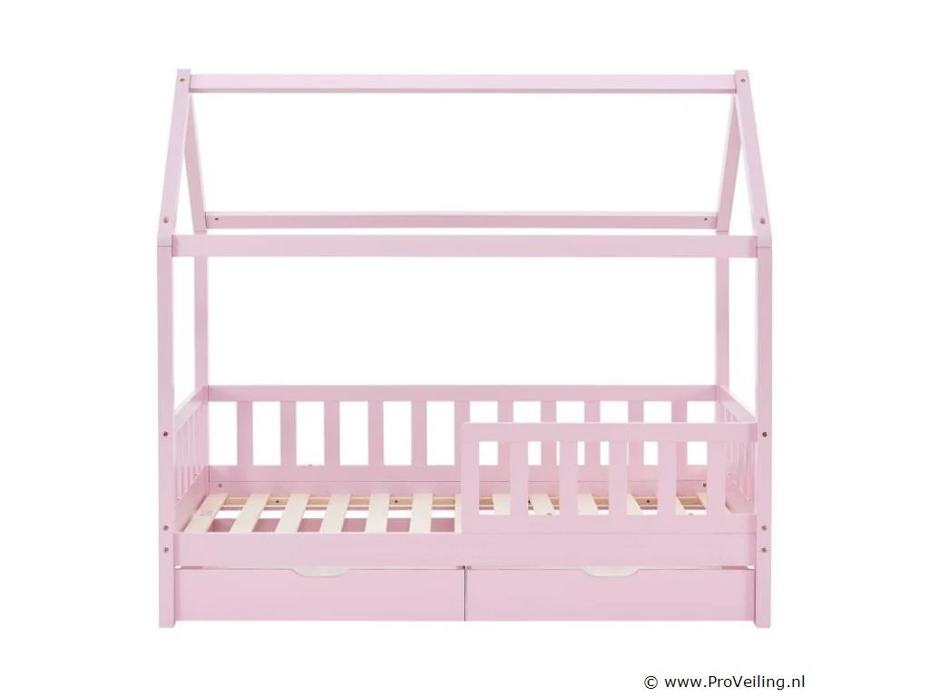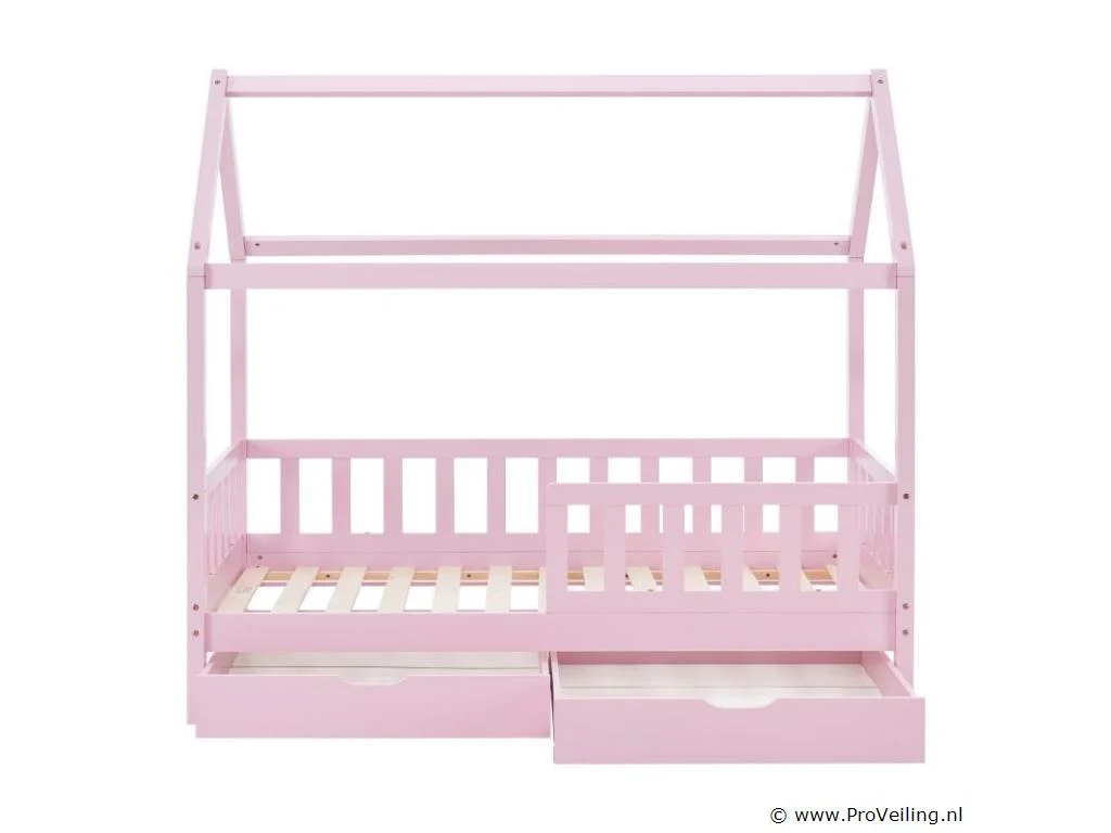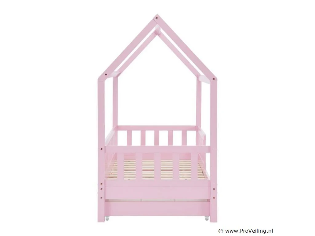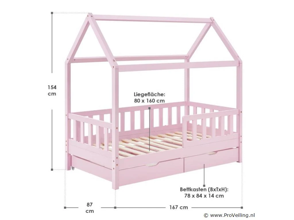 Het kinderbed Marli (160x80 cm, roze) met bedstee, valbeveiliging en lattenbodem maakt indruk op meisjes en jongens van 3 tot 10 jaar. Verfraai de kinderkamer met het moderne huisbed, een slaapplek, speelbed en opbergruimte in één. Speelgoed kan netjes worden opgeborgen in de grote 2-delige bedbak. En de huislook met dak biedt vele vormgevingsmogelijkheden - als grot of met een betoverende luchtdecoratie. Uitgerust met een rail biedt het bed ook meer bescherming en veiligheid voor jonge kinderen. Het houten bed van massief en onderhoudsvriendelijk grenenhout is de juiste keuze voor langdurig gebruik. Technische specificaties: Materiaal lijst: grenenhout Materiaal lattenbodem: hout, 13 latten Kleur: roze Maximale belasting: 125 kg Maximale belasting per lade: 25 kg Aantal lades: 2 Matras: Geen Afmetingen (ongeveer): Totale afmetingen (BxLxH): 87x167x154 cm Ligvlak (BxL): 80x160 cm Bedlade (BxDxH): 78x84x14 cm Leveringsomvang: 1 x kinderbed 80x160 cm 1 x lattenbodem 1 x dak 2 x bedlade 1 x Instructie