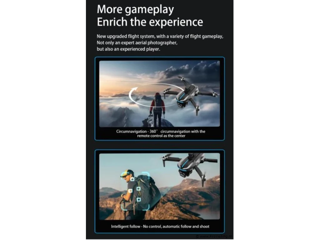 Productspecificaties: Afmetingen (cm): Uitgevouwen: 36 x 29 x 10 cm Gevouwen: 8,5 x 16 x 10 cm Afmetingen kleurdoos: 29 x 9,2 x 21,6 cm Belangrijkste materialen: ABS, hardware, elektronica Kleur: Zilver zwart Gewicht (inclusief verpakking): 808 g Startgewicht van de romp: 318 g Verpakkingsspecificaties: 21,5 x 15 x 18,5 cm Buitendoos specificaties: 46,5 x 43,5 x 57 cm Batterijparameters: 7,4 V 3400 mAh batterij (gewicht: 90 g) Oplaadmethode afstandsbediening: USB-kabel Oplaadmethode batterij: USB-kabel USB-oplaadtijd: Ongeveer 60 minuten Vliegtijd: Ongeveer 23 minuten Afstandsbedieningsafstand: Ongeveer 8000 meter (interferentievrije omgeving) 5G WIFI beeldoverdrachtsafstand: Ongeveer 500 meter (storingsvrije omgeving) Vluchtomgeving: Binnen/buiten Frequentie afstandsbediening: 2,4 GHz PTZ: ESC-afstandsbediening, 90 graden omhoog en omlaag GPS: Dubbele modus (GPS/GLONASS) Hekwerk: Hoogte 120 meter/afstand 300 meter verstelbaar Motorspecificaties: Borstelloze motor 1504 Cameraresolutie (5G-versie): Beeld: 8K (7680 x 4320 pixels) Video: 4K (3840 x 2160 pixels) Onderste opname: Foto: 1080P (1920 x 1280 pixels) Video: 720P (1280 x 720 pixels) Hekhoogte: 120 meter Hekafstand instelbaar tot 300 meter Lichtkleuren: Blauw/groen/rood Visuele functie: Positionering van de optische stroom aan de onderkant van de romp Producteigenschappen: 360° allround laser-obstakelvermijding GPS-positionering en optische stroompositionering dubbele modi Schakelen tussen dubbele camera's Borstelloze motor 8K pixels Elektrisch traploos verstelbare camera tot 90 graden Niveau 7 windweerstand Terugkeer naar huis bij controleverlies LCD-afstandsbediening Lage batterijwaarschuwing Terugkeer naar huis met één klik Batterijduur: ongeveer 23 minuten 5G high-definition beeldoverdracht Intelligent volgen Gebarenfotografie Video 50x zoom op het scherm Omringd door bezienswaardigheden Paklijst: Drone: 1 stuk Afstandsbediening: 1 stuk Obstakelvermijdingskop: 1 stuk Lichaamsbatterij: 1 stuk Opbergtas: 1 stuk Kleurvak: 1 stuk Instructies: 2 stuks Reserve ventilatorbladen: 4 stuks USB-oplaadkabel: 1 stuk Schroevendraaier: 1 stuk