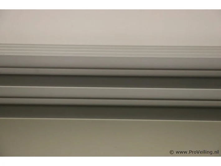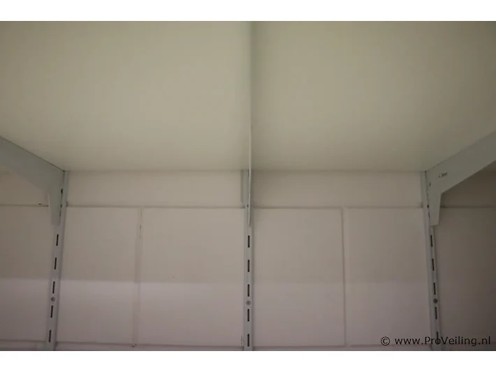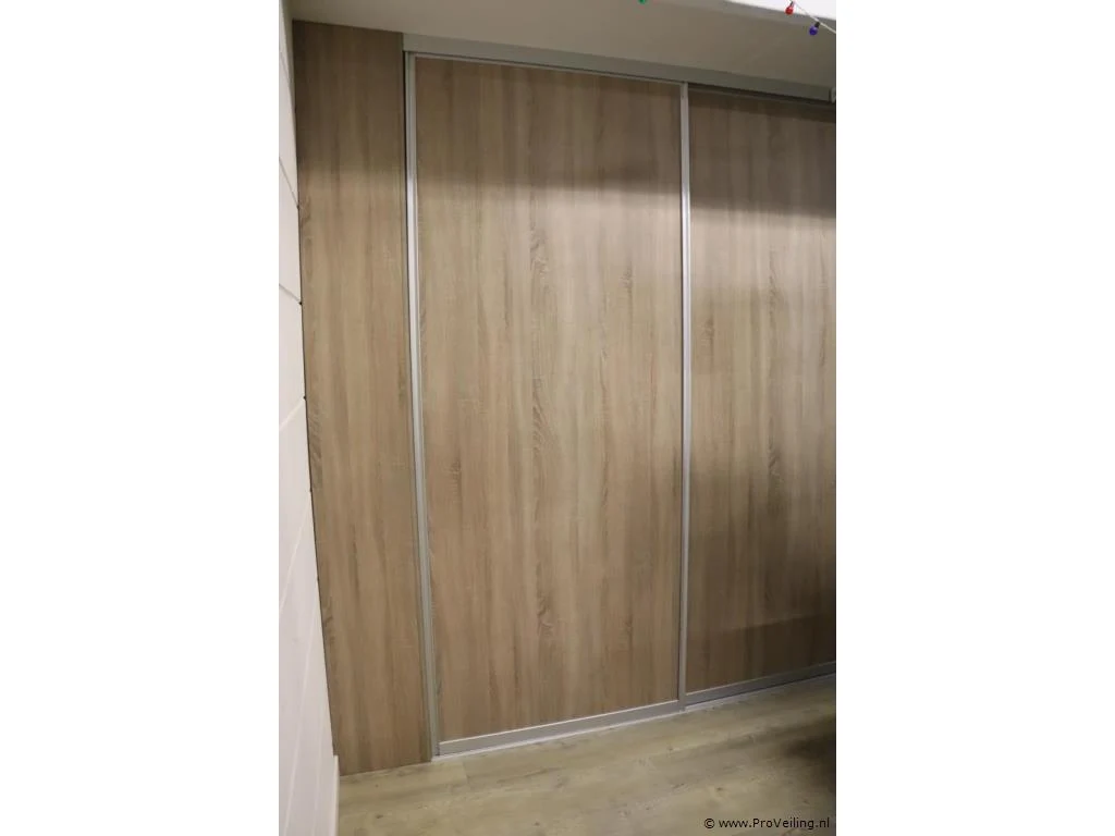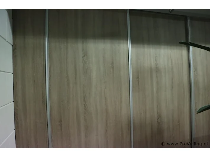 Wandkast met schuifdeuren; afmetingen deuren ca. 100x250x3cm (lxbxd); planken ca. 62x260x8cm (lxbxd); totale lengte ca. 750cm; excl. Inhoud. Door koper zelf vakkundig te demonteren op aanwijzing van ProVeiling.