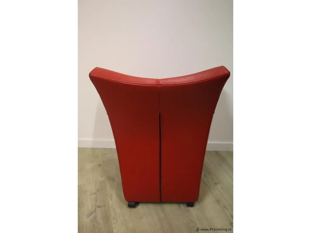 Fauteuils op wielen; kleur rood (skai) leder gestoffeerd; afmetingen ca. 58x56x82cm; zithoogte ca. 47cm; aantal 4 stuks.