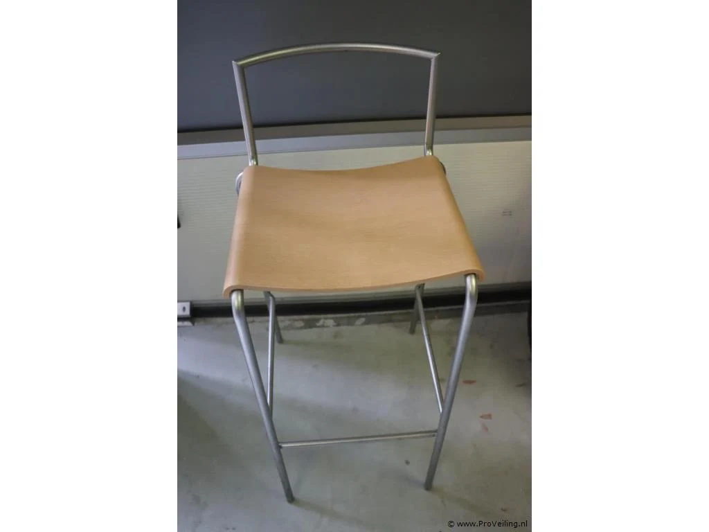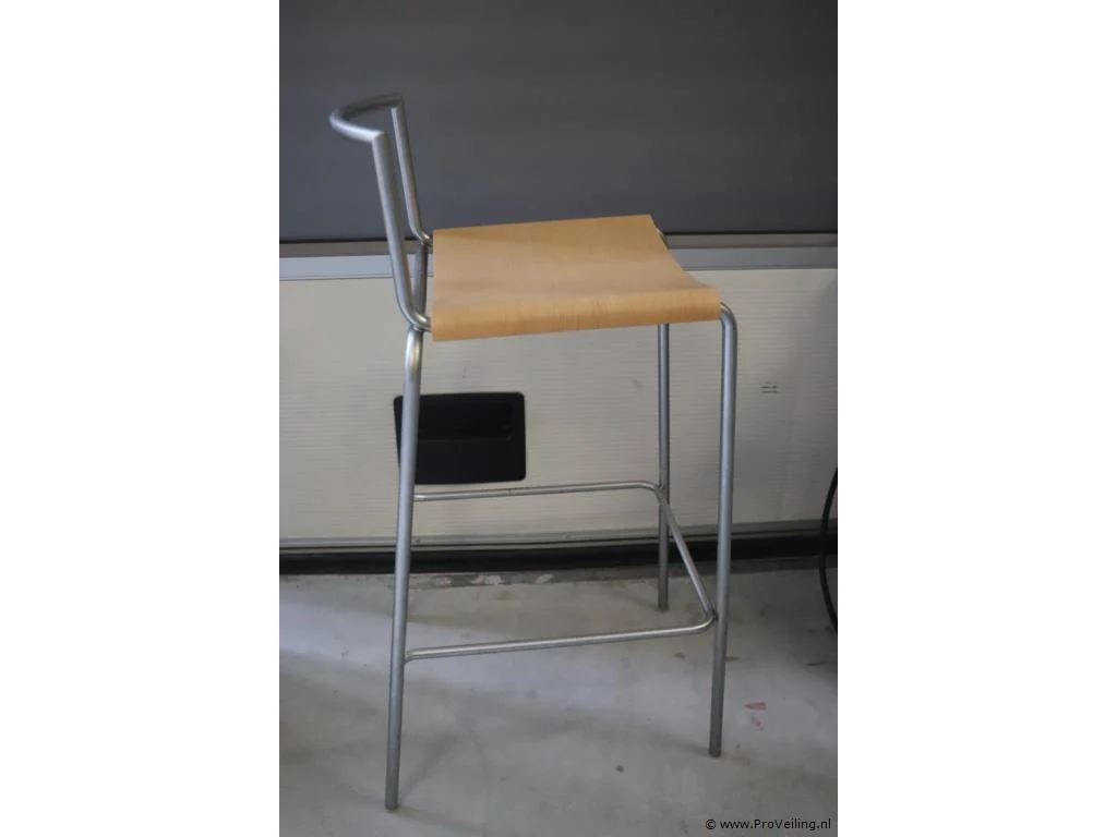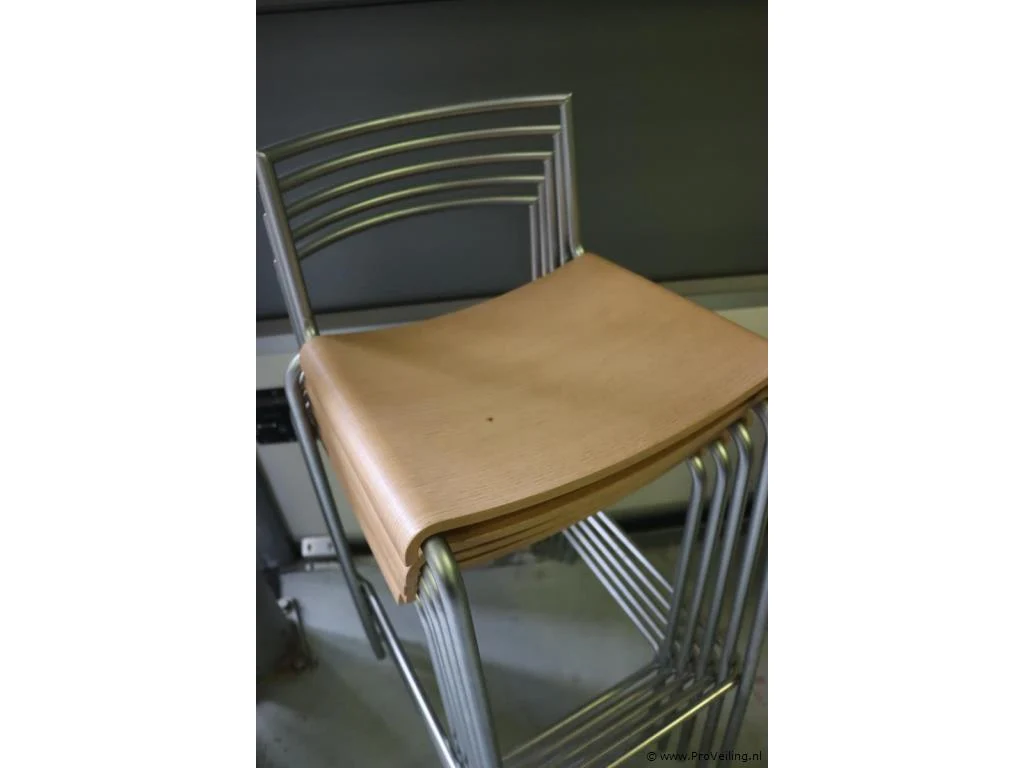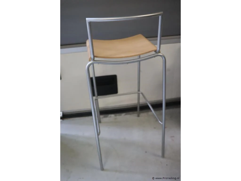 Barkrukken; materiaal: hout/metaal; afmetingen ca. 36-42x48x92cm; zithoogte ca. 76cm; aantal 5 stuks.