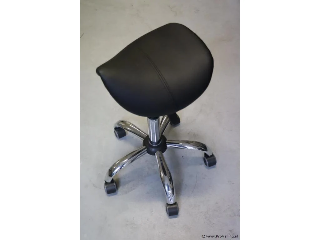 Zadelkruk/tabouret; kleur zwart (skai) leder; afmetingen ca. 54x64cm; zitvlak ca. 33x35cm.