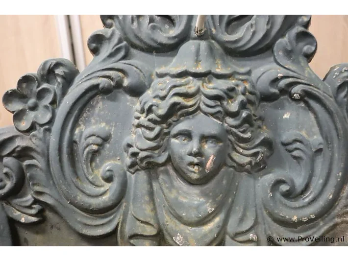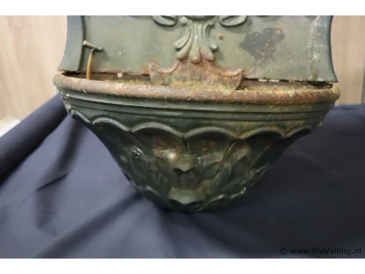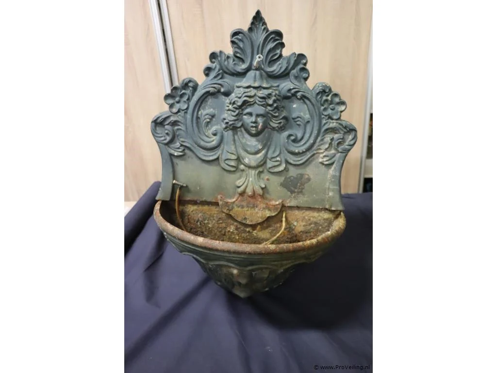 Antieke gietijzeren wandfontein; afmetingen ca. 50x30x73cm.