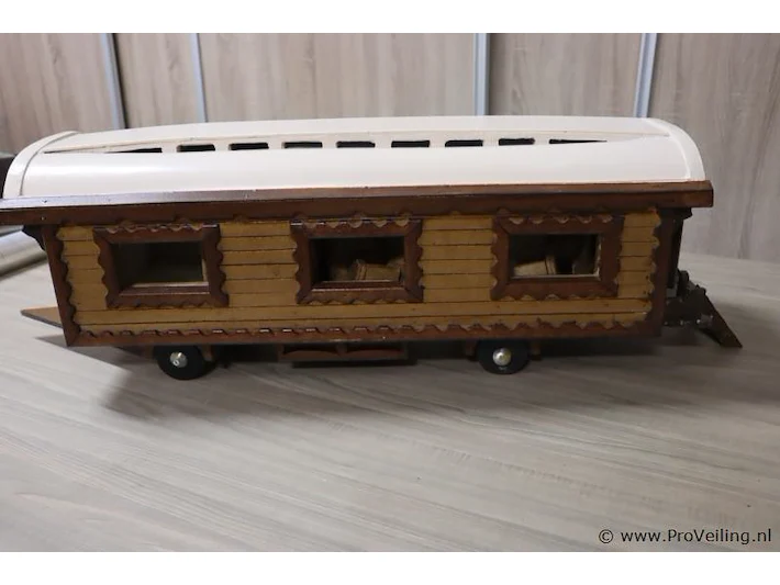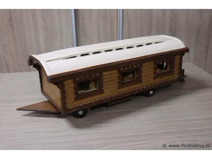 Houten model van een woonwagen/zigeunerwagen; afmetingen ca. 30x97x29cm.