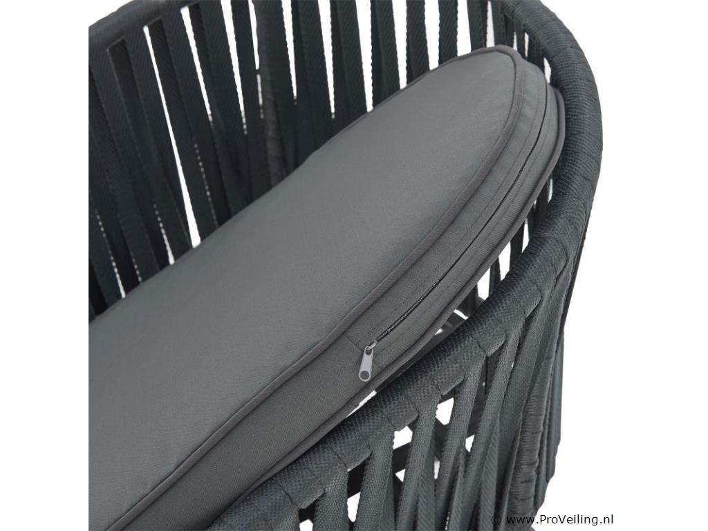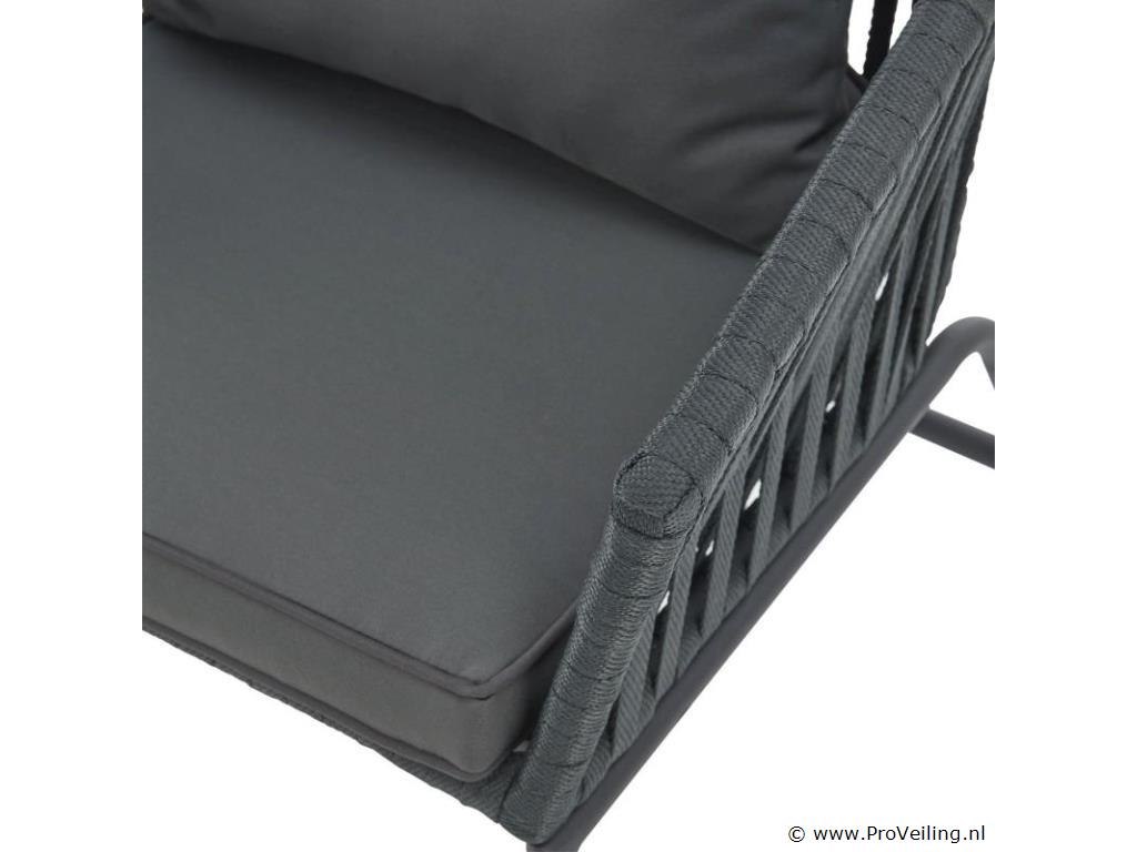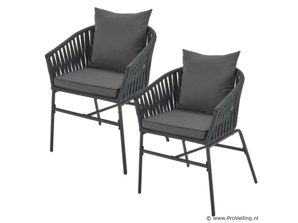 Stijlvol en elegant, met de 2 Rope stoelen zet u een bijzonder hoogtepunt op uw terras of balkon. Het touwgaas en de dikke bekleding zorgen voor een bijzonder zitcomfort. De constructie is uiterst robuust en dankzij de poedercoating corrosie- en krasbestendig. Technische specificaties: Materiaal frame: staal (gepoedercoat) Materiaal gaas: polypropyleen Materiaal bekleding: 100% polyester Kleur frame: zwart Vlechtkleur: donkergrijs Kleur bekleding: donkergrijs Maximale belasting: 160 kg Afmetingen (ongeveer): Totale afmetingen (LxBxH): 58x58x78 cm Zithoogte: 48 cm Dikte zitkussen: 5 cm Dikte rugkussen 12 cm Leveringsomvang: 2 x stoel 2 x zitkussens 2 x rugkussens 1 × montage-instructies