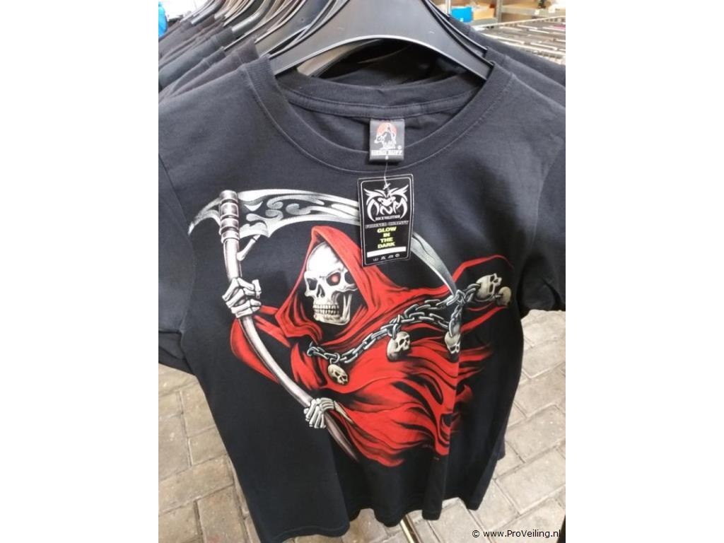 Ca. 70 stuks rock chang shirts. Maat S tm XXL. Ook glow in the dark shirts. Voor en achterkant druk. Katoen.