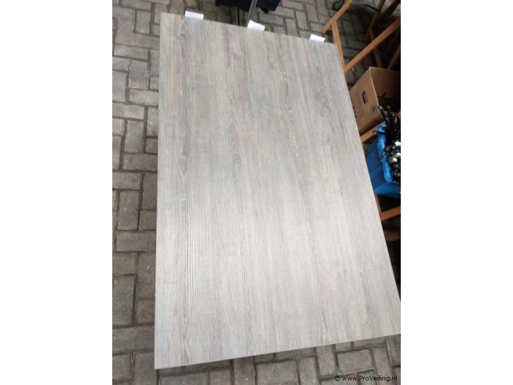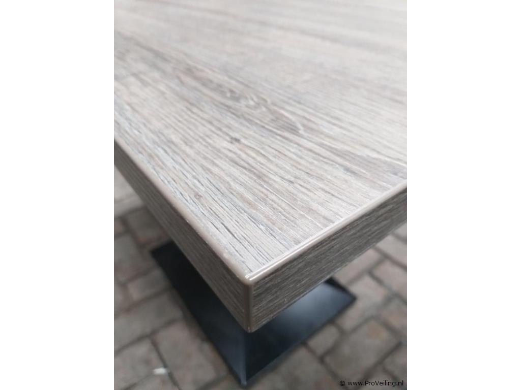 Horeca tafel, met grijs houtlook tafelblad en een zwart metalen onderstel. Afm.: 75.5 cm hoog/ 110 cm lang/ 70 cm breed. In goede staat.