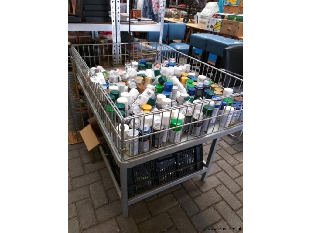 IJzeren verkoopbak inclusief spuitbusjes. Afmeting verkoopbak: 85 x 115 x 78 cm. Spuitbusjes zijn geschikt voor diverse doeleinden. Voor binnen/ buitengebruik. Spuitbusjes zijn nieuw/ Verkoopbak gebruikt maar in zeer nette staat.