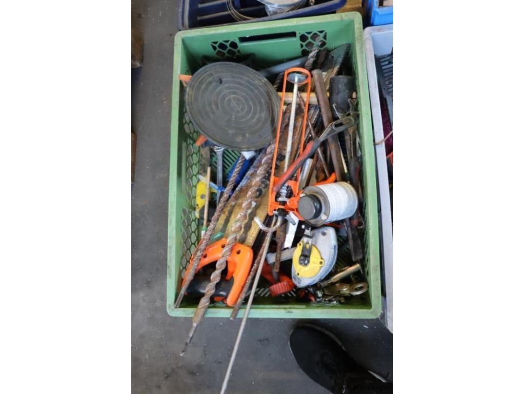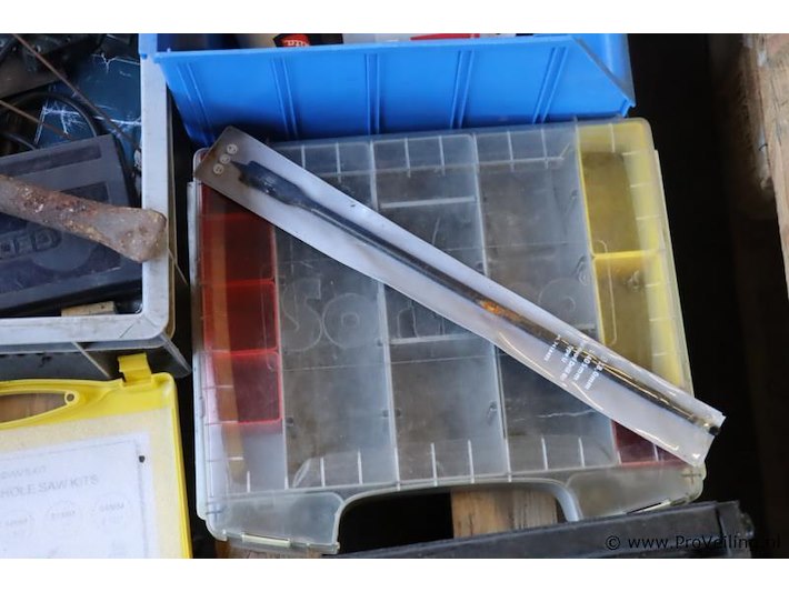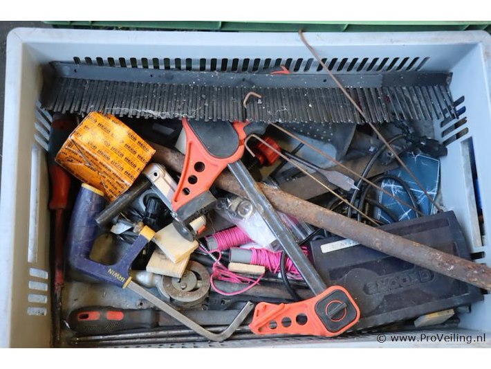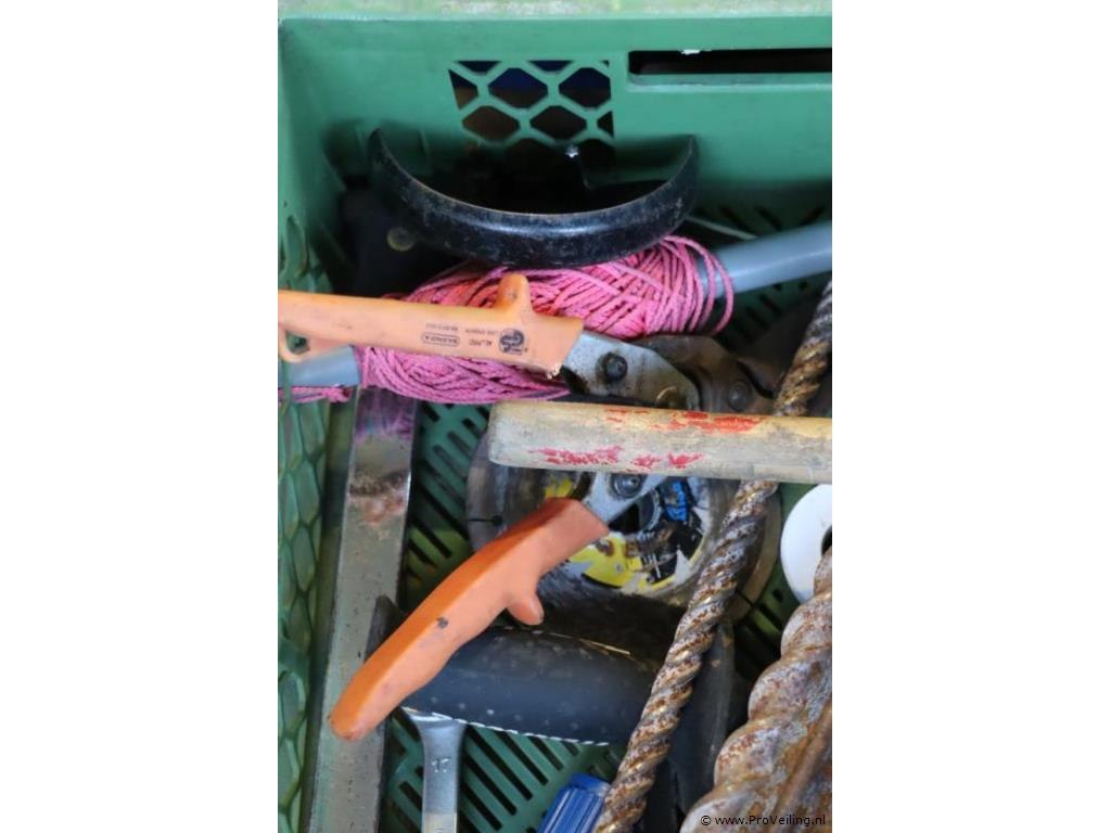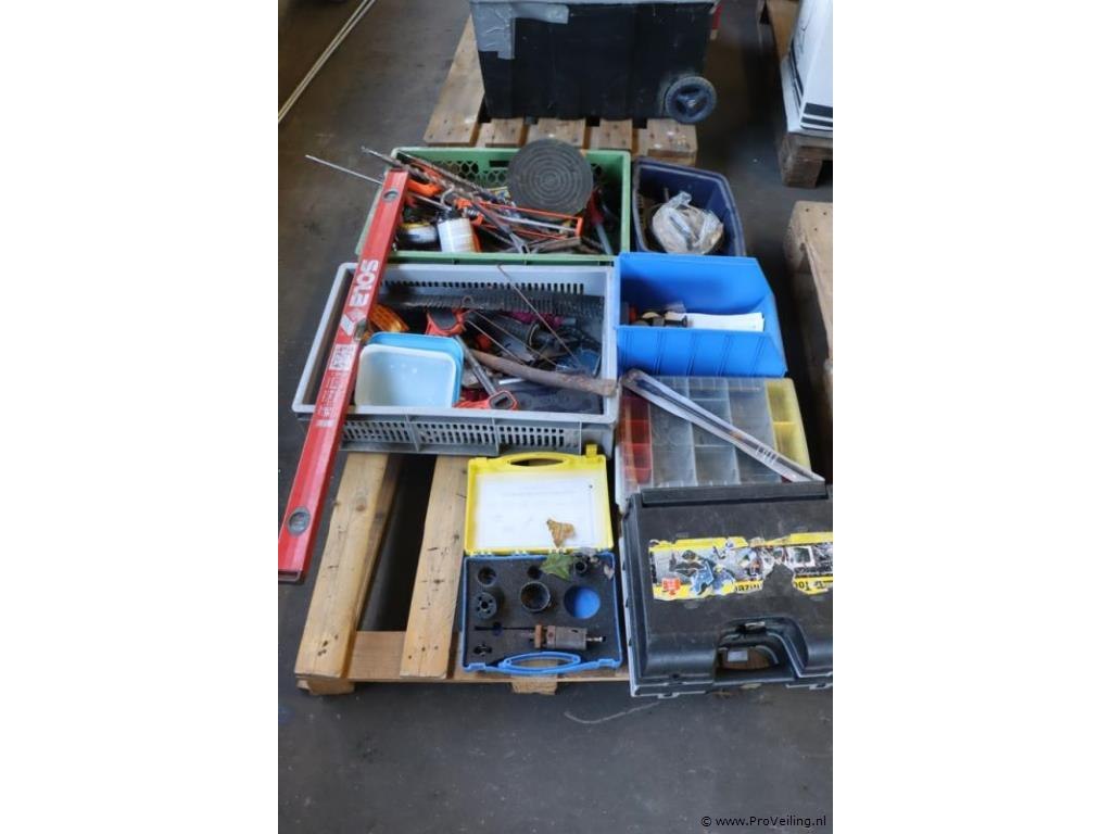 Partij diverse gereedschappen & bevestigingsmaterialen op pallet o.a. Sola waterpas, gatenzaag; boren & handzaag; zie afbeeldingen.