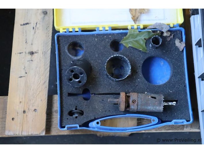 Partij diverse gereedschappen & bevestigingsmaterialen op pallet o.a. sola waterpas, gatenzaag; boren & handzaag