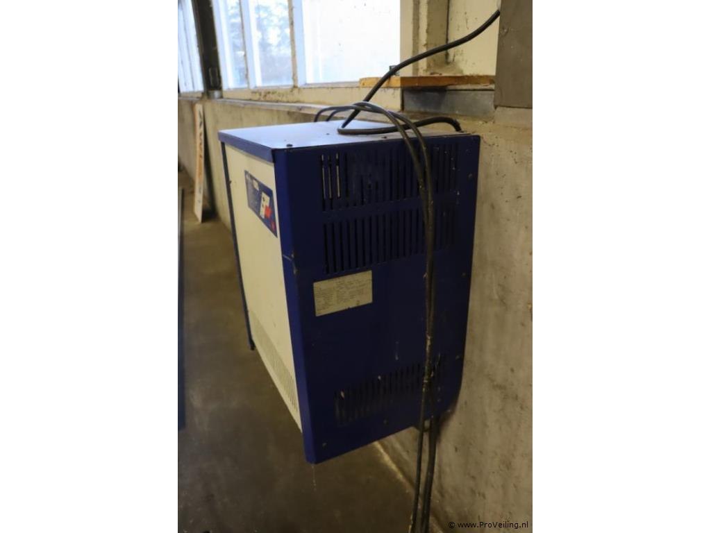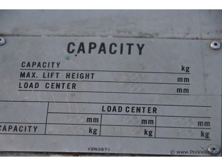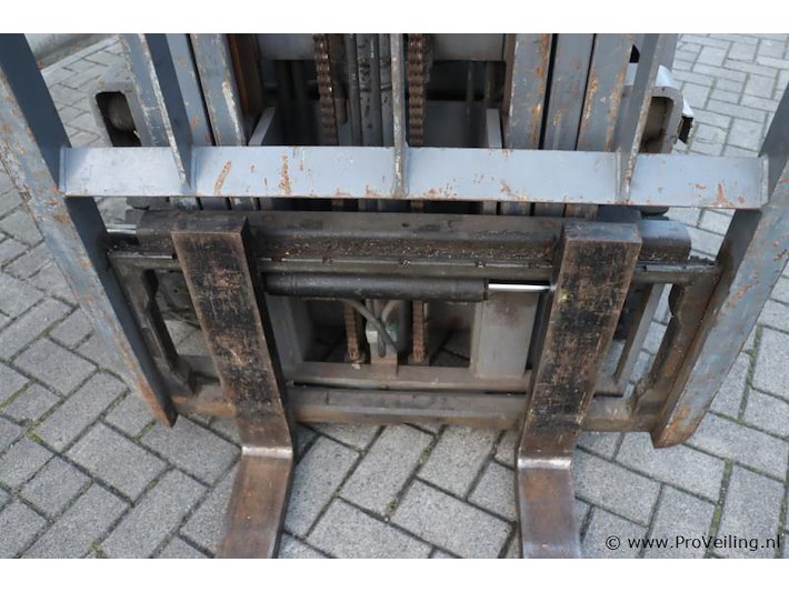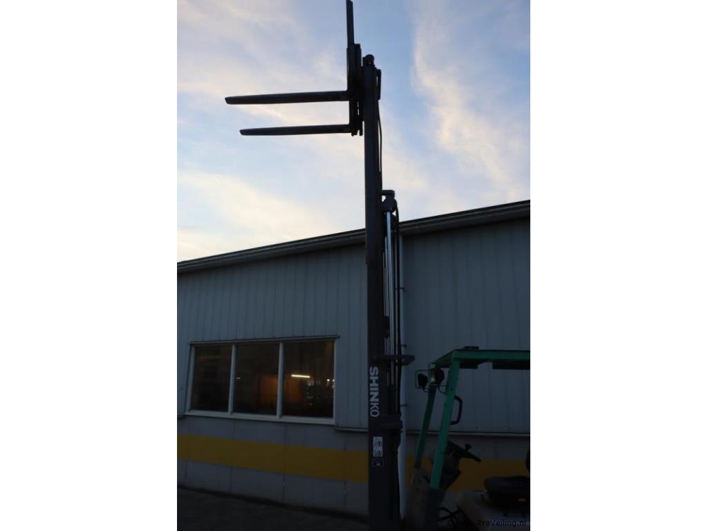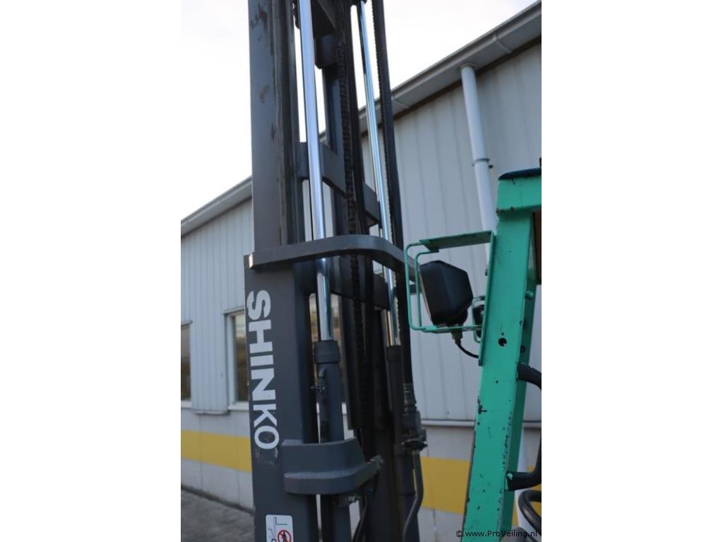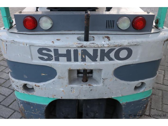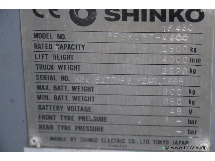 Vorkheftruck, elektrisch: merk Shinko; model 6FB15Z-V; bouwjaar: 1998; gewicht: 2220kg; capaciteit max. 1500kg; max. lift height: 4000mm; load center: 500mm; 26991,3km; incl. oplader; afmetingen ca. 192x105x195cm; lepels ca. 115x10x7cm.