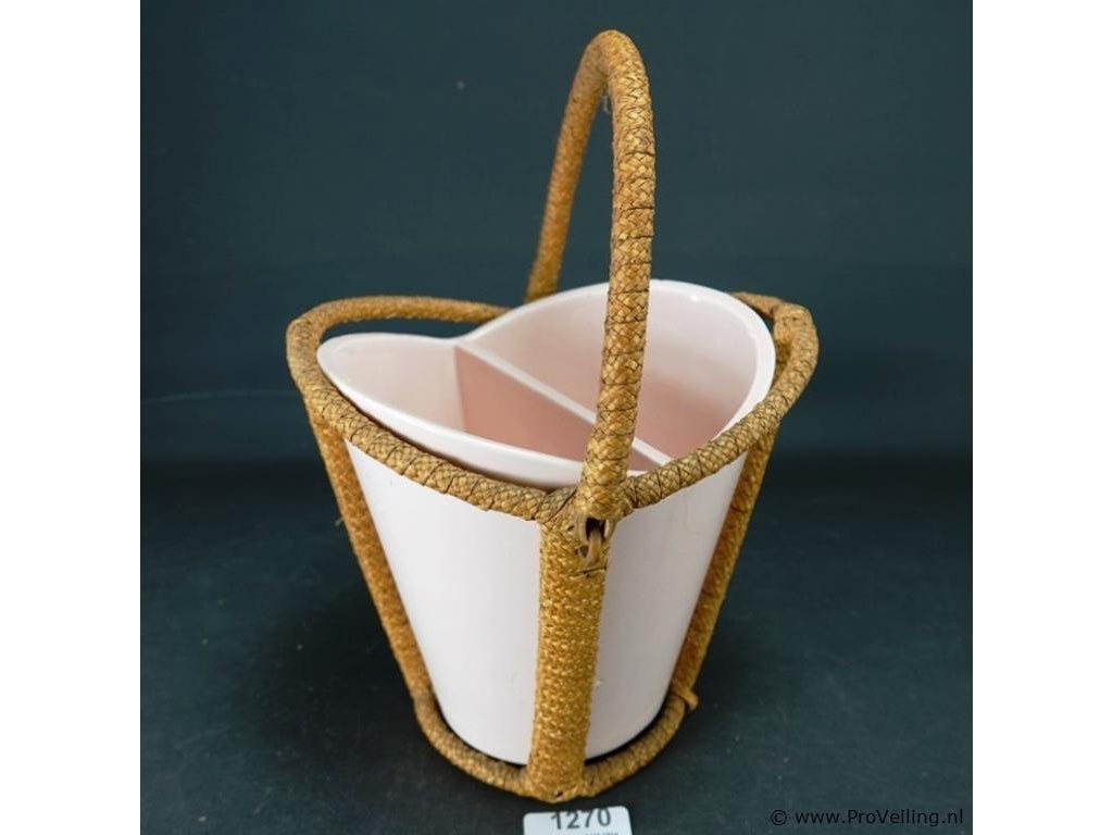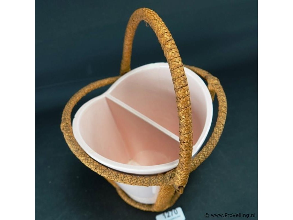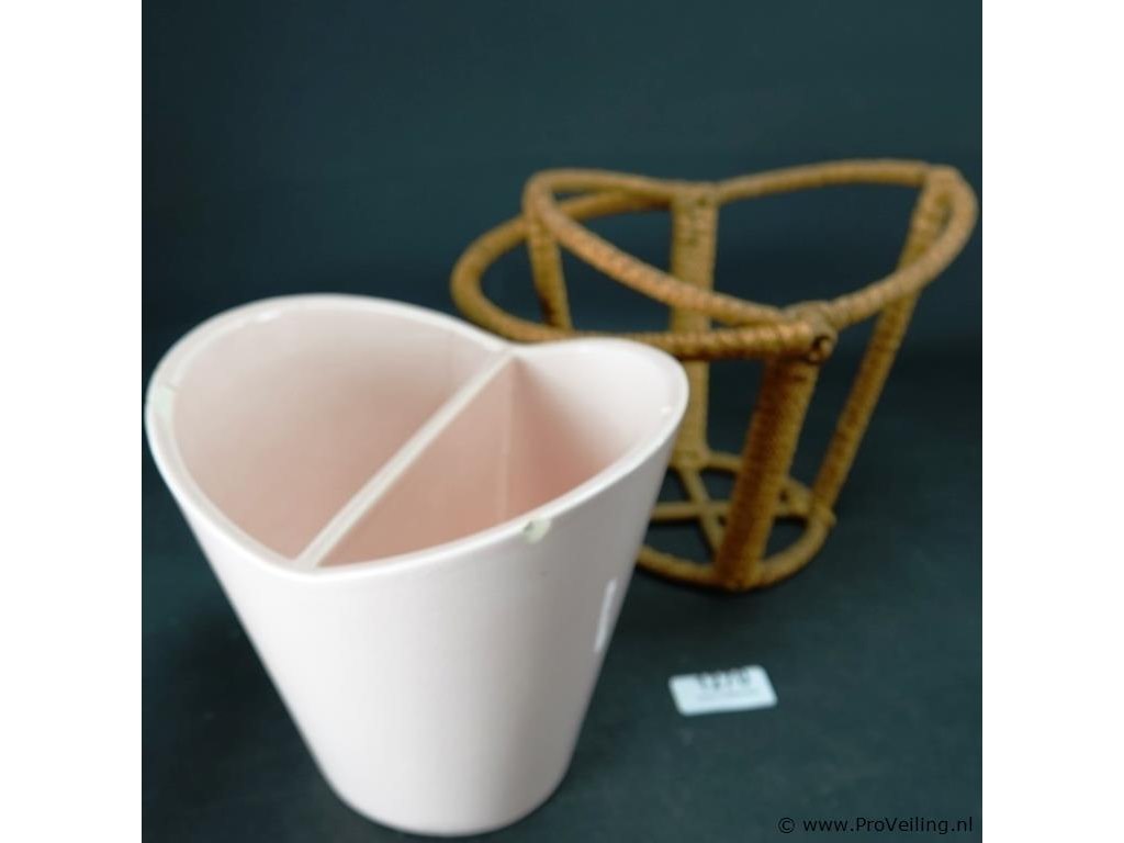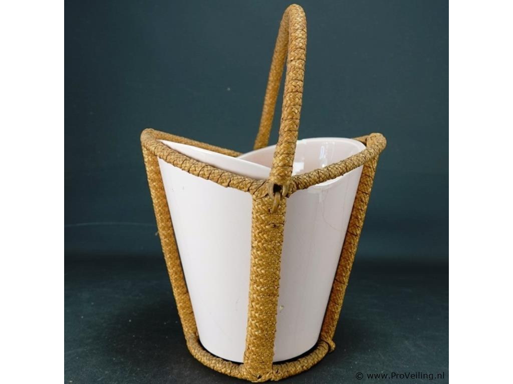 Aardewerk vakvaas in rieten draagmontuur