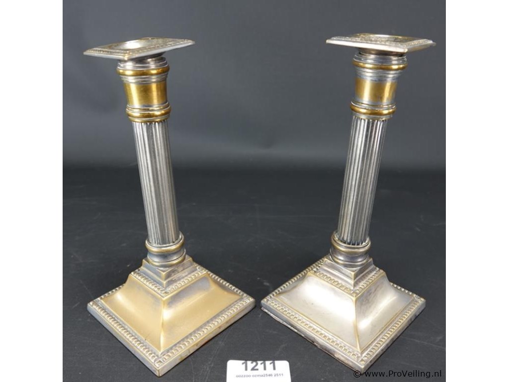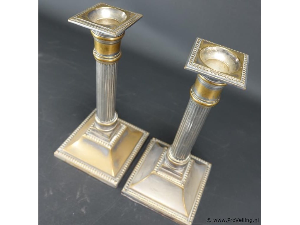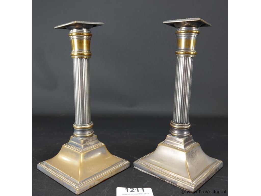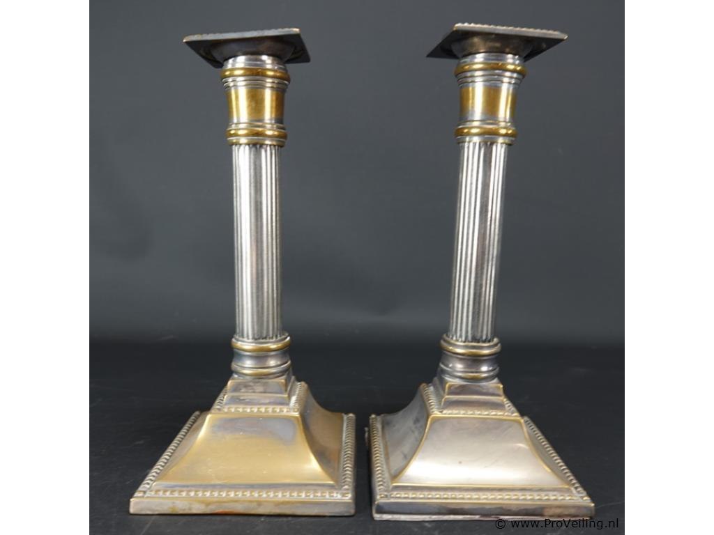 Paar zuilvormige sheffield-kandelaars uit de 18e eeuw
