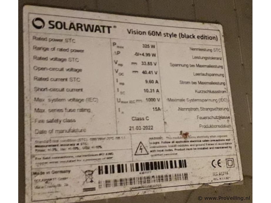 Zonnepanelen: merk Solarwatt; type Vision 60M Style (Black Edition); aantal 1 pallet á 23 stuks.