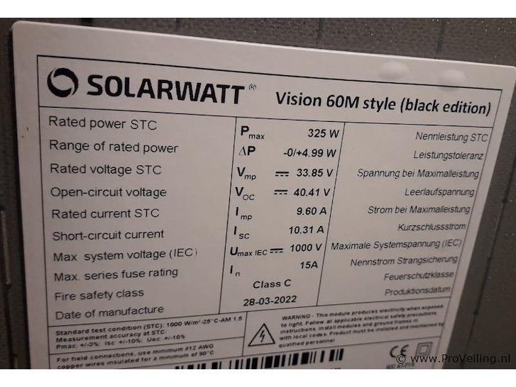 Zonnepanelen: merk Solarwatt; type Vision 60M Style (Black Edition); aantal 1 pallet á 30 stuks.