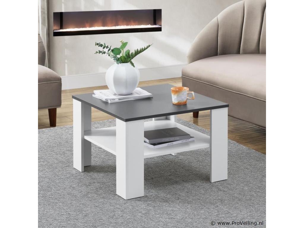 Met zijn compacte design en de eenvoudige, rechtlijnige look past de tafel in wit en donkergrijs perfect in bijna elke sfeer. De afmetingen van slechts 60 x 60 cm maken hem ideaal voor kleine ruimtes of als discrete bijzettafel. Op zijn 2 niveaus biedt hij verrassend veel ruimte voor drankjes, snacks, tijdschriften of afstandsbedieningen. De woonkamertafel is gemaakt van hout, wat hem niet alleen veerkrachtig en robuust maakt, maar ook licht van gewicht. Dankzij de melaminecoating zijn de oppervlakken ongevoelig voor krassen en zeer onderhoudsvriendelijk. Technische specificaties: Materiaal: spaanplaat E1 (melamine gecoat) Kleur: wit/donkergrijs Afwerking: Mat Maximale belasting: 50 kg Afmetingen (ongeveer): Totale afmetingen (LxBxH): 60x60x40 cm Afmeting vak: 57x57 cm Hoogte vak: 19 cm Materiaaldikte: 15 mm Bodemvrijheid: 20 cm Leveringsomvang: 1 × tafel 1 × montage-instructies