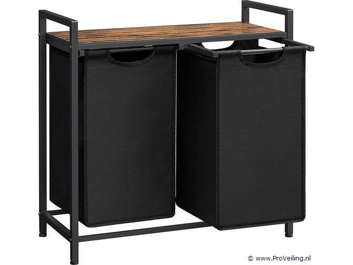 XDays Wasmand 2 vakken – uitschuifbaar met plank - 73 x 33 x 71 cm - was sorteerder - 88 liter verdeeld over 2 zakken – wasmanden zwart metaal en bruin hout; winkelprijs 42,95 euro.