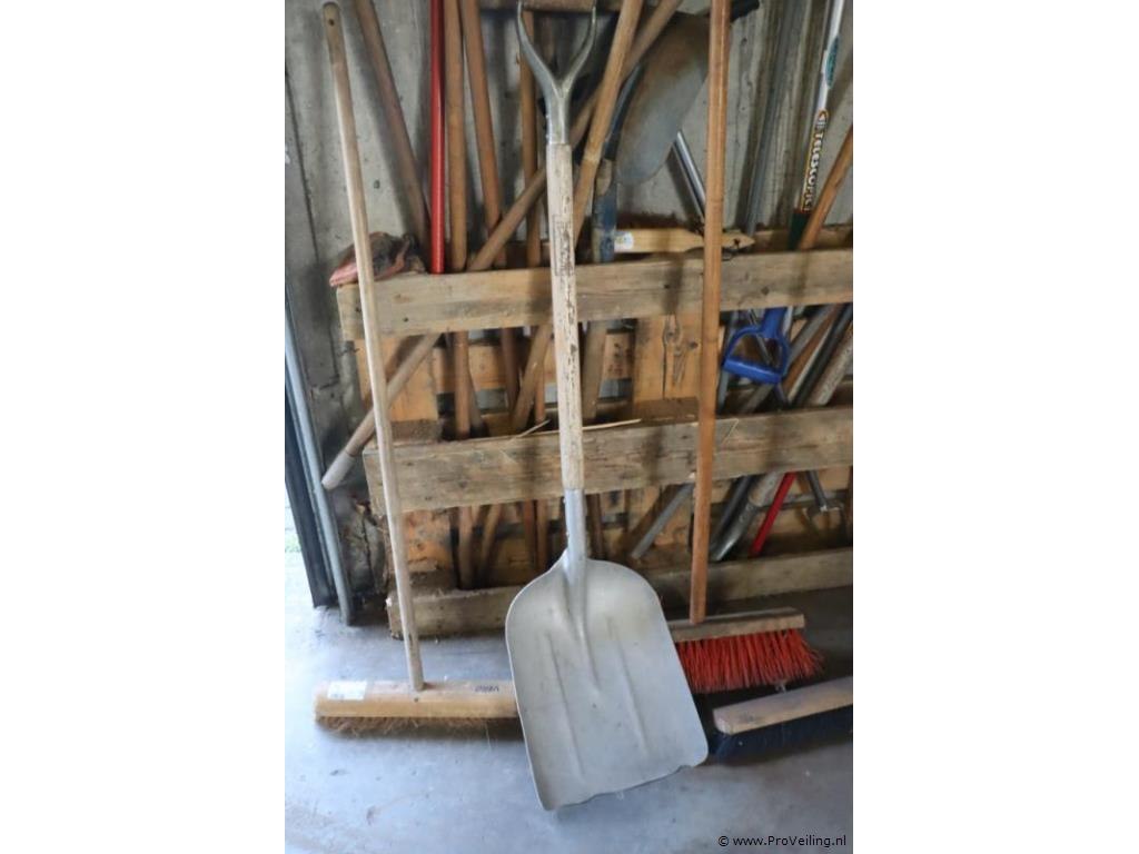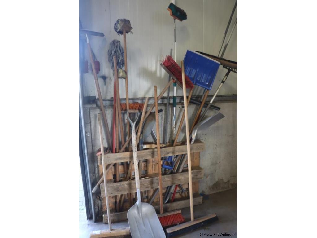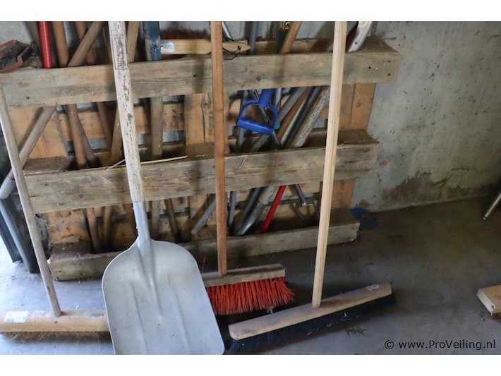 Partij diversen soorten (tuin) gereedschap o.a. bezems, sneeuwschep, dweil & hark; zie afbeeldingen.