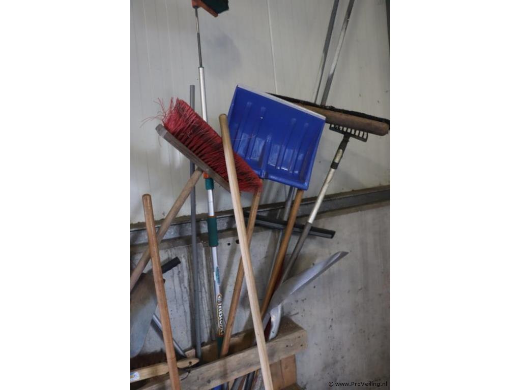 Partij diversen soorten (tuin) gereedschap o.a. bezems, sneeuwschep, dweil & hark