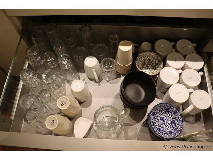Inhoud kasten bestaande uit o.a. kopjes, glazen, theedoeken & bestek