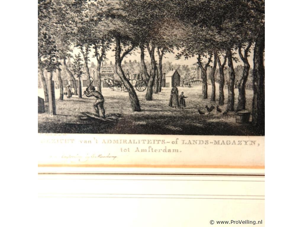 Oude gravure uitzicht van 't Admiraliteits- of Lands-magazijn tot Amsterdam. In passe-partout, achter glas en in houten lijst. H46cm/B53cm/2175Gr. Lees a.u.b. ook de extra veilinginformatie voor deze veiling. G-E-E-N transport of bezorging door Proveiling mogelijk. Eventueel transport of bezorging alleen door u zelf te regelen via b.v. www.brenger.nl .