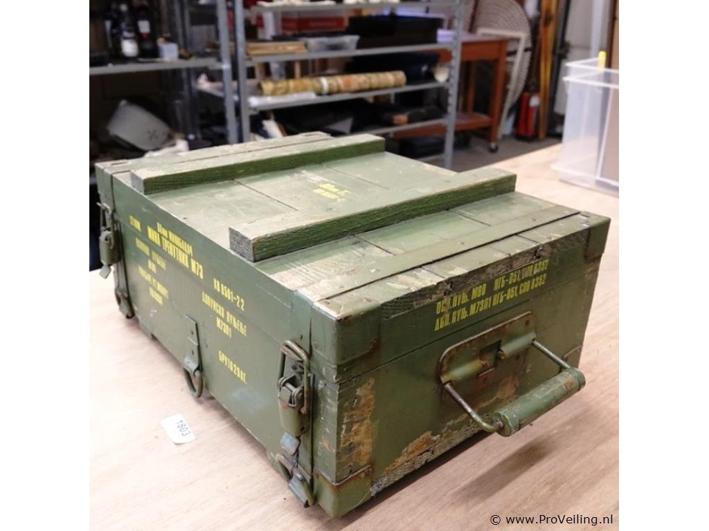 Militaire munitiekist uit het voormalige Joegoslavië. Gevuld met grote partij DVD's. H22cm/L49cm/B35cm/4000Gr. Lees a.u.b. ook de extra veilinginformatie voor deze veiling. G-E-E-N transport of bezorging door Proveiling mogelijk. Eventueel transport of bezorging alleen door u zelf te regelen via b.v. www.brenger.nl .