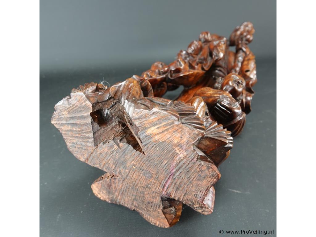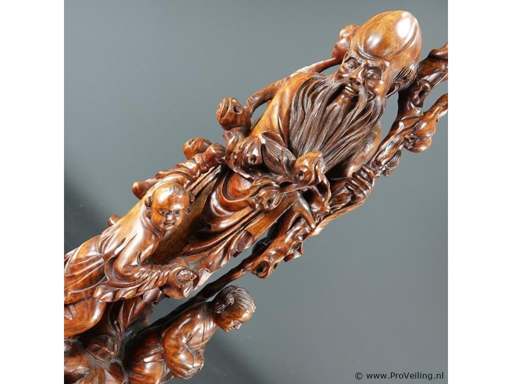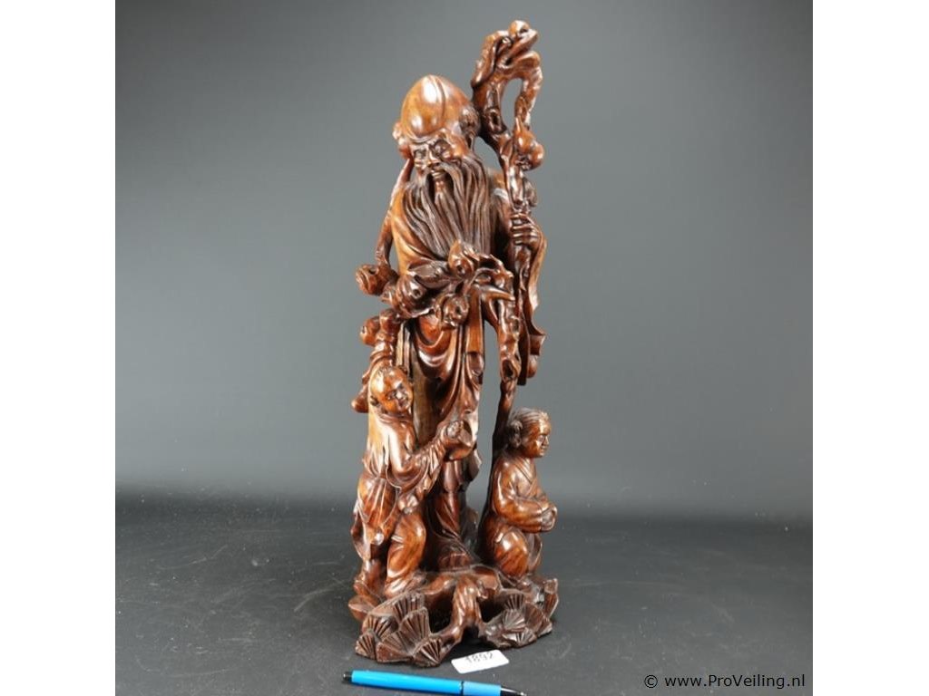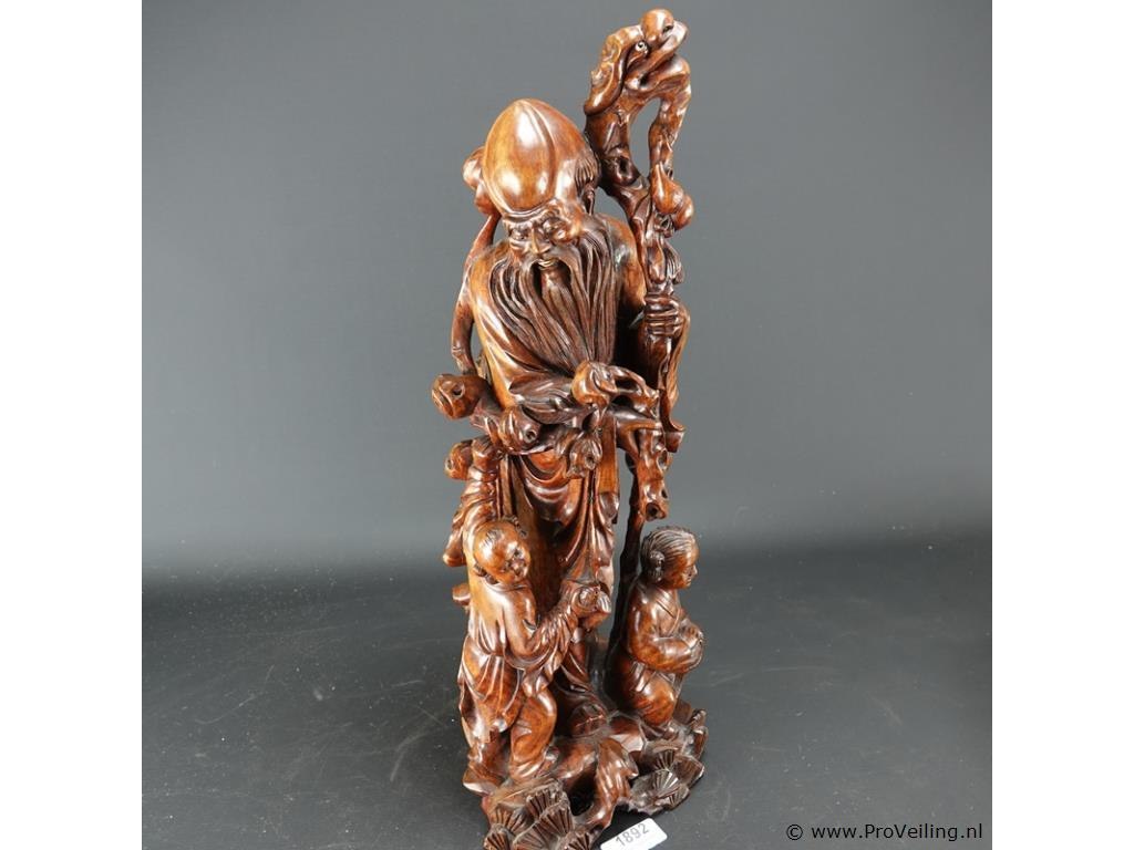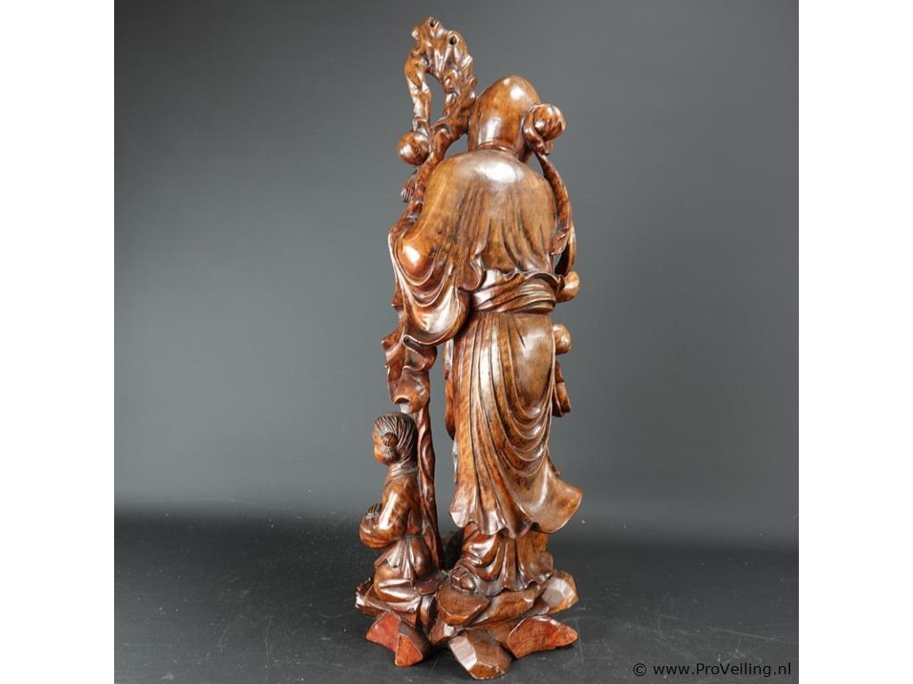 Oud groot rozenhouten beeld van een chinese wijze met staf en kinderen