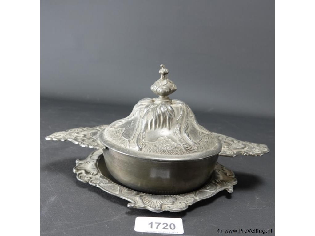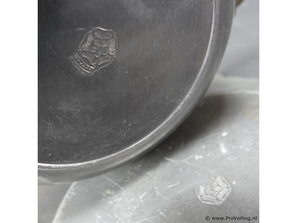 Tinnen écuelle/porringer. Aan onderzijde gemerkt. Vroeger gebruikt voor het eten van halfvloeibare voedingsmiddelen zoals pap of bouillon. H18cm/B30cm/1795Gr. Lees a.u.b. ook de extra veilinginformatie voor deze veiling!.