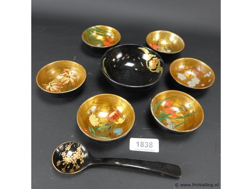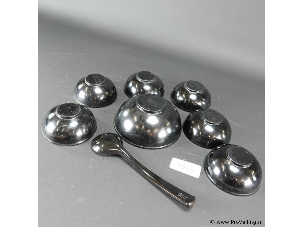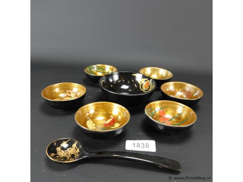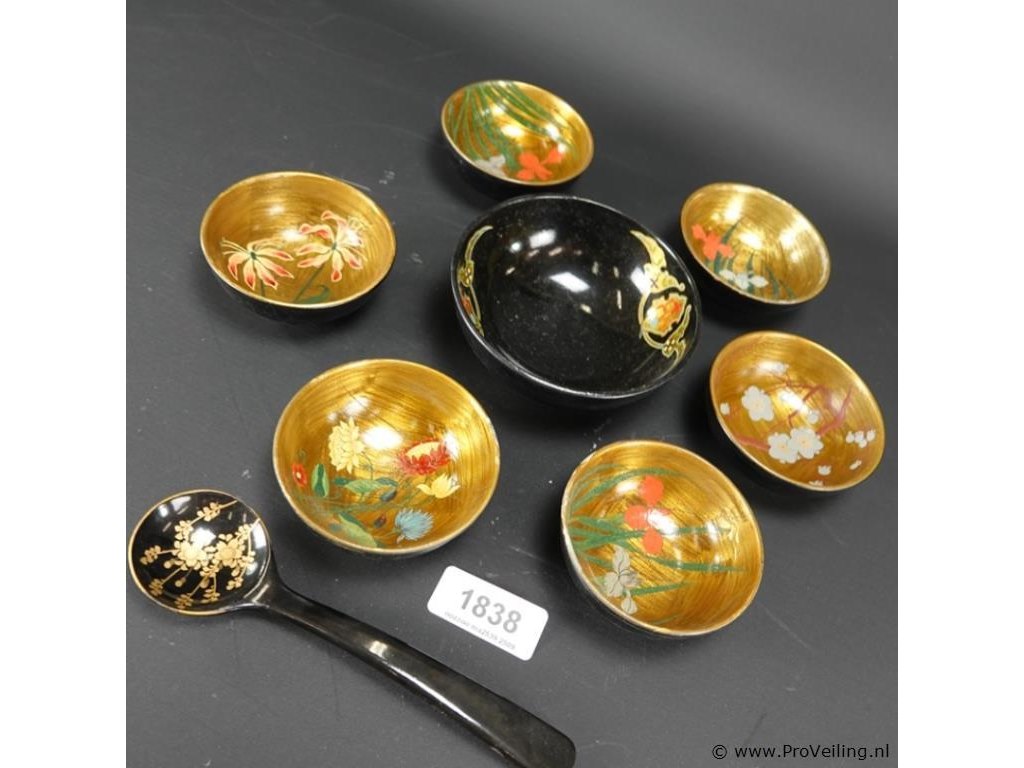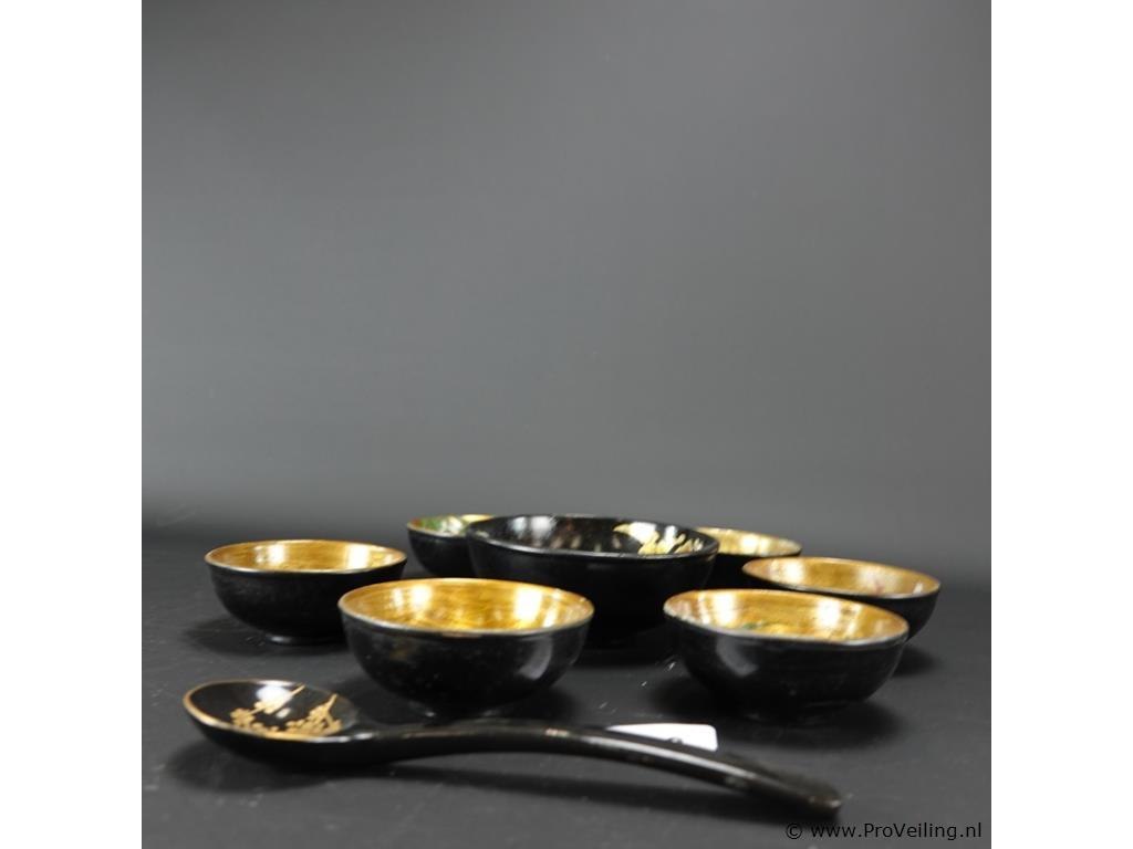 Laqué Oosterse pindaset met lepel. H6cm/D12cm/252Gr. Dit betreft een tijdens transport kwetsbaar product! Uw transportrisico voor deze kavel is zeker in combinatie met andere kavels hoog. Lees daarom a.u.b. ook de extra veilinginformatie voor deze veiling!.