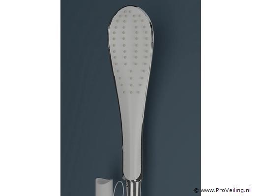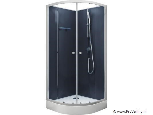 Complete doucheopstelling bestaande uit cabine, spoelbak/bodem, doucheset en wandplank; afmetingen: 85x85x195cm.