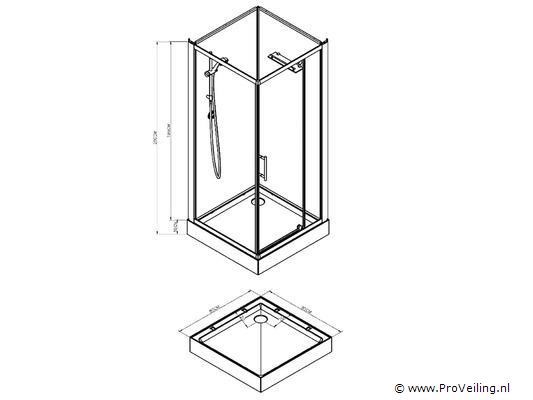 Complete doucheopstelling bestaande uit cabine, spoelbak/bodem, doucheset en wandplank; afmetingen: 85x85x210cm.