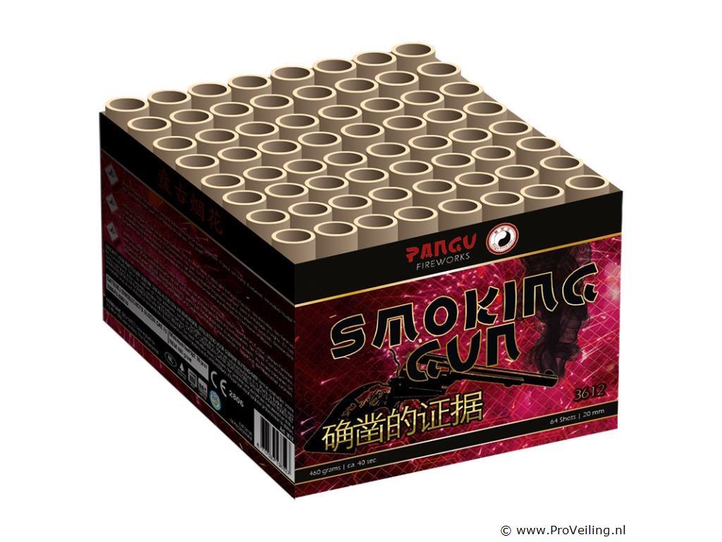 Smoking Gun, 64 shots 20mm cake. Met deze cake uit de serie van Pangu Fireworks haalt u maar liefst 64 schoten siervuurwerk uit een relatief klein product. Afgewisseld schiet deze cake heldere blinkers, heftige crackling tails, gouden palmen, glitter palmen en een finale salvo met heftige crackling de hemel in. Een top cake in zijn diversiteit.