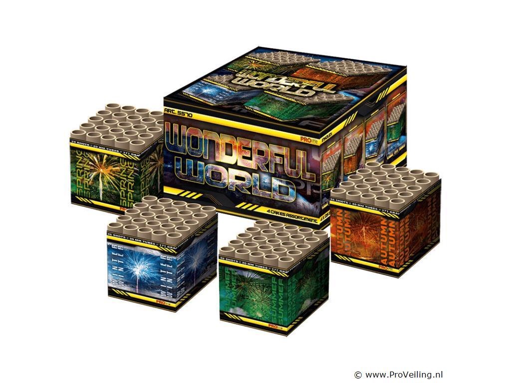 Wonderful World, cakeselection met 4x25 shots siercakes. Dit vuurwerkpakket bevat vier siercakes welke ieder 25 schoten afvuren. Een leuke set met verschillende effecten voor de liefhebber welke het leuk vindt om meerdere lontjes aan te steken tijdens zijn oudejaarsavond.