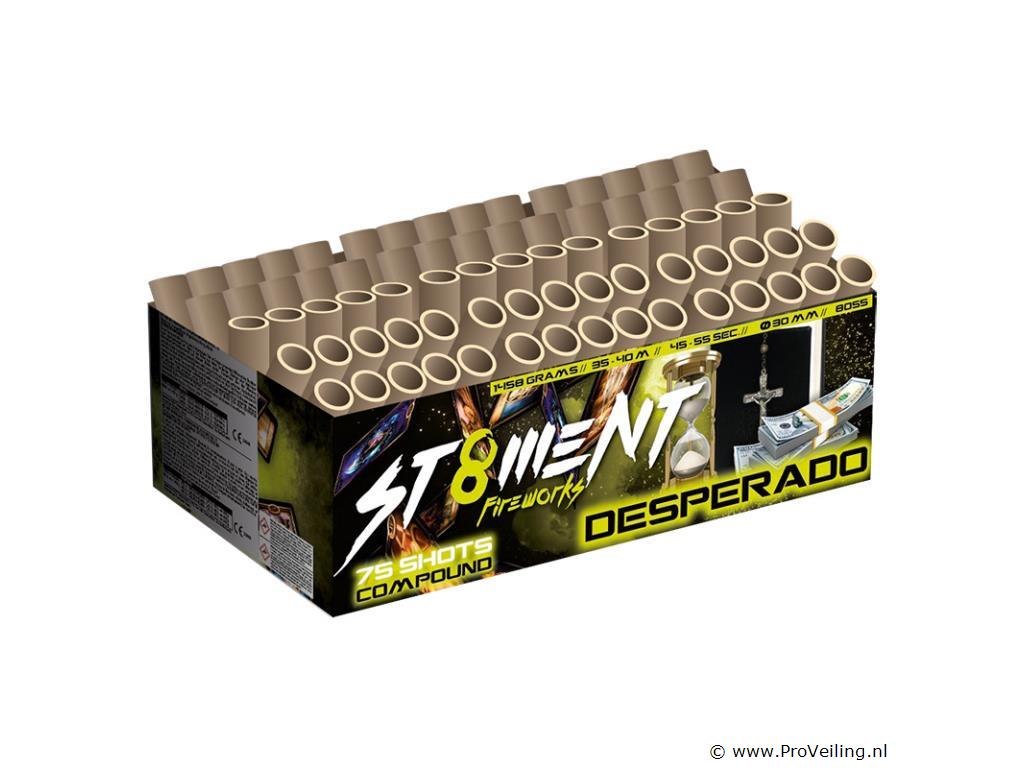 De Desperado is een unieke compound van drie 25 shots fanshape cakes! Geweldig heldere siereffecten worden in vijf breed de lucht in geschoten!