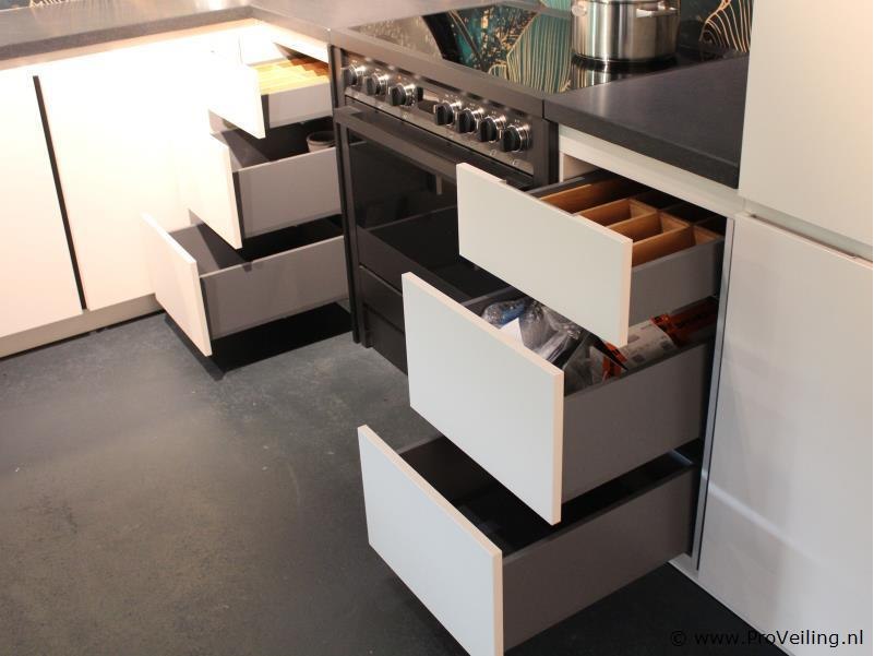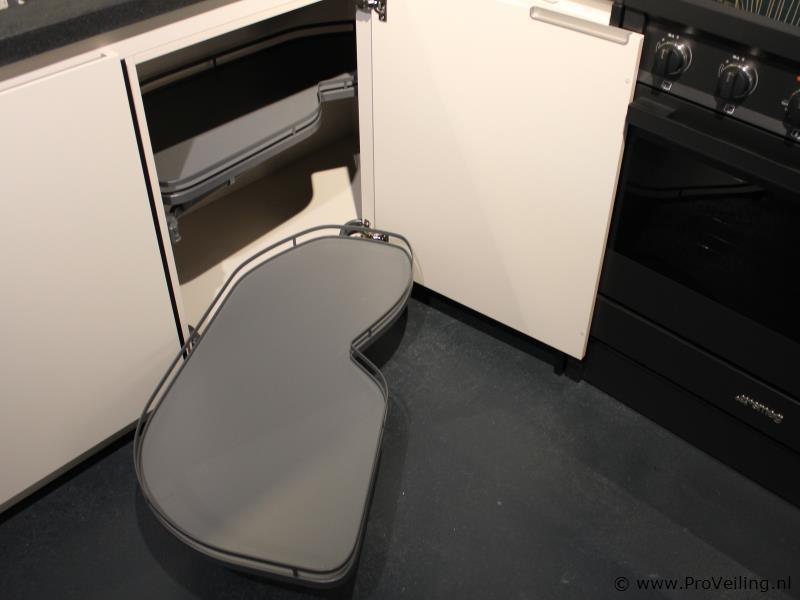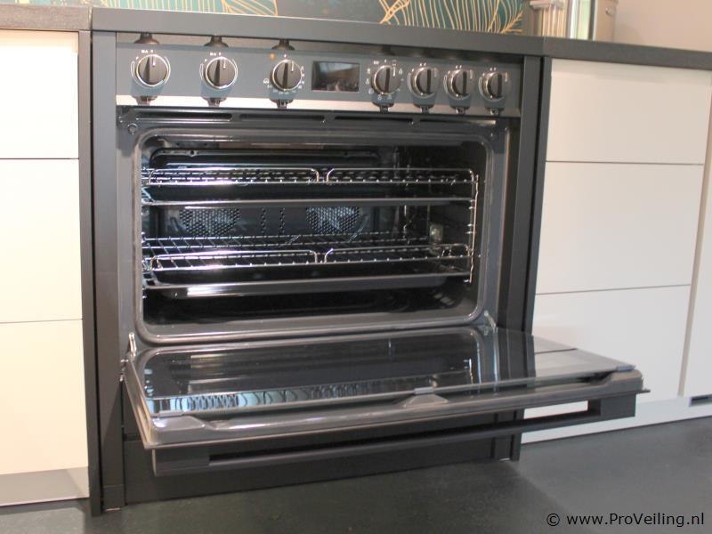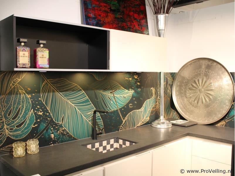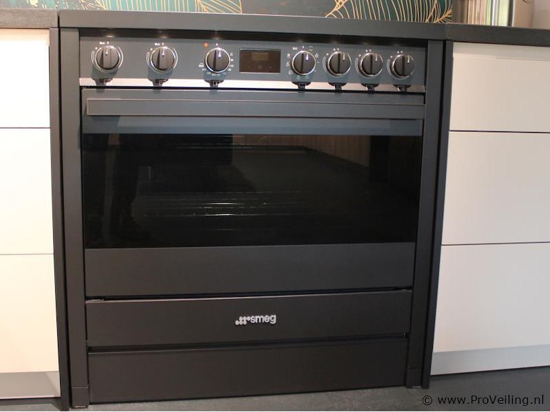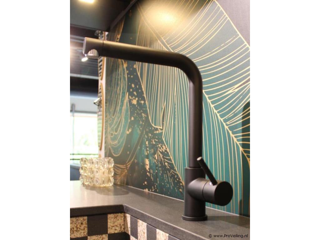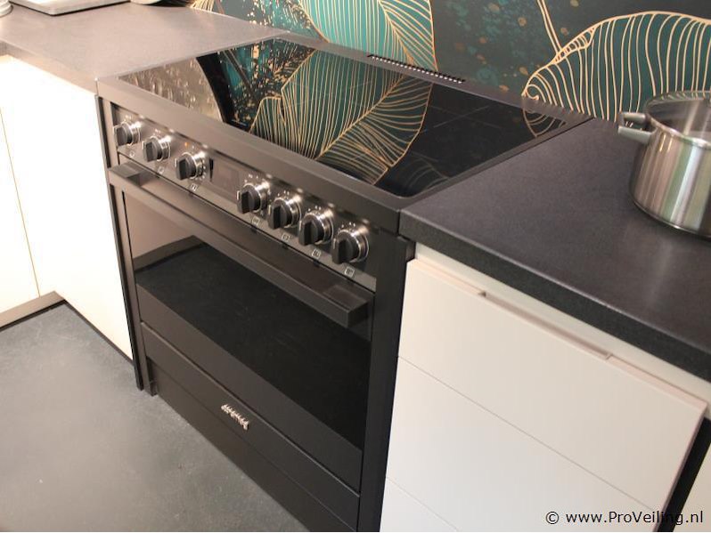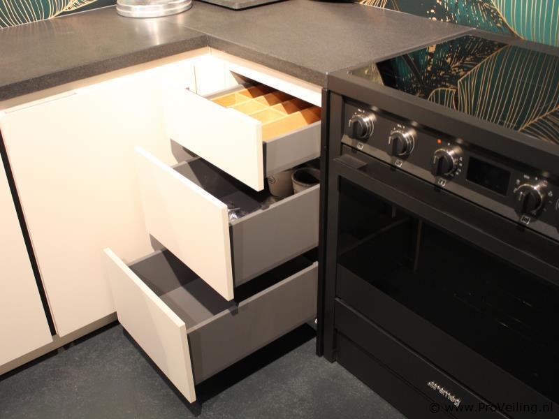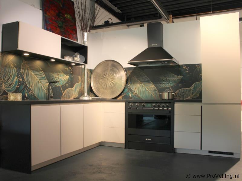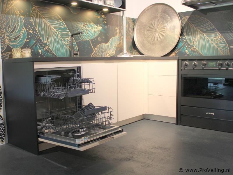 Merk: Beckermann Type: Hoekkeuken Model: Peru Frontkleur: Sandbeige Plintkleur: Sandbeige Grepen: Greeploos Afmetingen ca.: 251 x 310 cm - hoog 236 cm - Werkbladhoogte 95 cm Vaatwasser: Siemens SD6PW1S - Volledig geïntegreerde inbouwvaatwasser - Geschikt voor circa 12 tot 16 couverts - Energieklasse E - Meerdere wasprogramma’s met temperatuurkeuze - Startuitsteloptie en aquastopbeveiliging - Stil en energiezuinig in gebruik Fornuis: Smeg B95IMAN9 - Vrijstaand fornuis inductie/elektro 'Professionale' met 5 inductie kookzones - kleur antraciet - booster functie - Multizone - automatische aanpassing panafmeting - 1 oven met 9 kookfuncties - inhoud 115 liter - grill - timer - Touch displa - ECOlogic - vapor Clean - opbergruimte met klep enSoftclose deur - het powermanagement systeem maakt het mogelijk om het fornuis aan te sluiten op 2- of 3-fasen. Afzuigkap: Smeg wandafzuigkap 90 cm breed - Zwarte uitvoering in Victoria-stijl - Decoratief piramide-model - Montage tegen de wand - Luchtafvoer of recirculatie mogelijk - Capaciteit tot ca. 595 m³/uur - 3 snelheden - Geluidsniveau ca. 66 dB(A) - LED-verlichting Koelkast: Bosch KIR41SDF0 - Integreerbare koelkast Serie 6 met superkoelen - inhoud 211 liter - touchControl - 6 Veiligheidsglas plateaus - SoftClose deur sluiting en LED-verlichting met SoftStart. Vriezer: Bosch VIV11A - Inbouw-vriezer - Netto inhoud 72 liter - Energieklasse E - Geluidsniveau ca. 36 dB(A) - LowFrost-technologie (minder vaak ontdooien) - Supervriezen functie voor snel invriezen - Deur-op-deur montage systeem - Draairichting deur verwisselbaar - 3 transparante vrieslades - Nishoogte circa 72 cm - Netto inhoud vriesgedeelte 72 liter - Invriesvermogen ca. 8 kg/24u - Bewaartijd bij stroomuitval circa 21 uur Werkblad: Composiet - kleur gemêleerd donker grijs/grafiet - 3 cm hoge werkbladrand - facet geslepen Spoelbak: Onderbouw tegeltjesbak gemêleerd (rechthoekig) Kraan: Eén-hendel keukemengkraan - hoog hoekmodel, past emmer onder - kleur zwart Conditie: Showmodel Bijzonderheden: U dient deze kavel zelf te demonteren - Zonder afgebeelde accessoires / materialen (Diversen) op en in de keuken Ter waarde van: € 21950 Productbeschrijving: Hoekkeukenopstelling met Smeg fornuis en afzuigkap - Siemens vaatwasser - Bosch koel-vriescombinatie - Hoekonderkast met LeMansysteem (2 volledig uitzwenkbare plateaus met aluminium reling) - Twee korvenkasten links en rechts naast fornuis met beukenhouten bestekindelingen - Wandkast met één schuiffront - LED-verlichting onder de wandkasten - Zwarte keukenkraan en uniek ingelegd spoelbakdesign met dambordmotief. Demontage 1: U dient deze kavel zelf te demonteren - planning is op zaterdag 13 december of eerder in overleg - keuken bevind zich op begane grond Demontage 2: Demontage en bezorging van deze keuken is mogelijk. Neemt u contact op met onze servicedesk via: info@proveiling.nl voor meer informatie. Conditie: Showroommodel Garantie: Wettelijke fabrieksgarantie.