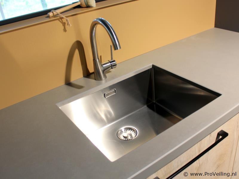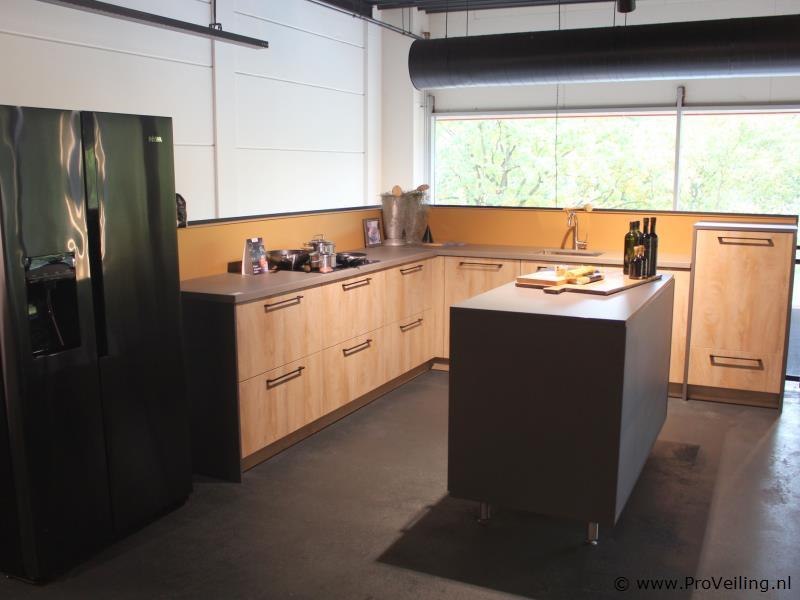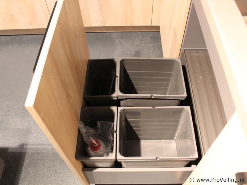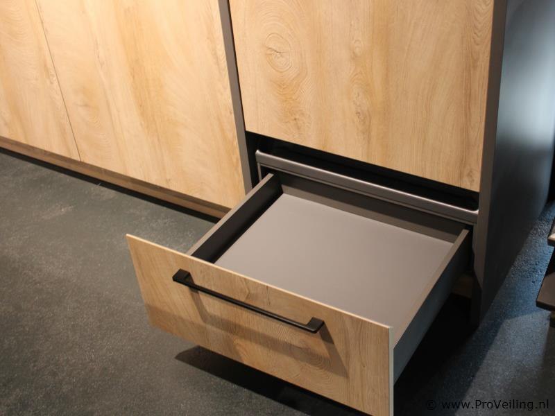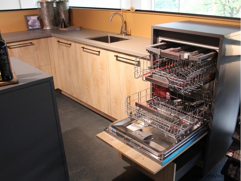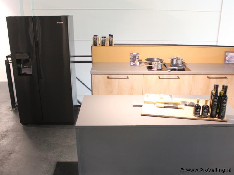 Merk: Beckermann Type: Hoekkeuken met werkeiland Model: Tessina Classic Frontkleur: Mammut Eiche (licht eiken repro) Plintkleur: Mammut Eiche (licht eiken repro) Grepen: 320 mm brede metaal greep in de kleur graphit Afmetingen ca.: 307 x 310 cm - Hoogte vaatwasserkast 121 cm Afmetingen ca.: Werkeiland 156 x 73 cm - Werkbladhoogte 100 cm Vaatwasser: Bosch SMV8ZCX07N - volledig geïntegreerde inbouwvaatwasser - 8 programma's - Capaciteit: 14 standaard couverts - Waterverbruik: ca. 9,5 l per cyclus - Besteklade: VarioLade Pro (bovenin) - zeolietdroging - smartbediening via app - Max Flex Pro met verstelbare bovenkorf (3 standen), EasySlide-uittreksysteem en RackMatic-hoogteverstelling - Beveiliging tegen waterschade: Bosch AquaStop-systeem met levenslange garantie Kookplaat: Pelgrim Inductiekookplaat met geïntegreerde afzuiging - Energieklasse A+ - Max. afzuigcapaciteit 620 m³/h (luchtafvoer) / 520 m³/h (recirculatie) - Bedieningswijze LightOnly sliderbediening - 4 kookzones - Boostfunctie op elke kookzone - Randafwerking: afgeronde glasafwerking Oven 1: Pelgrim OVM826RVS - Multifunctionele oven RVS - 11 functies - extra functies: ontdooien, borden verwarmen, snel voorverwarmen en warmhoudfunctie - telescoopgeleiding - soft-close ovendeur - stoomschoonprogramma Koelkast: Etna AKV378IZWA - Vrijstaand Amerikaanse koelkast – Kleur zwart (Black Steel) – Inhoud koelgedeelte 334 l – Inhoud vriesgedeelte 165 l – Totale inhoud 499 l – Energieklasse F – Jaarlijks verbruik circa 378 kWh – Geluidsniveau 43 dB(A) – No-Frost Plus (koel- en vriesgedeelte) – MultiFlow 360° luchtcirculatie – Water- en ijsdispenser in deur met uitneembaar watertank (4,5 l, geen vaste wateraansluiting nodig) – Inverter-compressor – CrispZone groente/fruit-lades – Luchtfilter (tegen geurtjes) – LED-display op deur – Flaconsrek in koelgedeelte – Afmetingen (h × b × d) circa 1 791 × 910 × 646 mm – Vrijstaand model, vriesgedeelte links gepositioneerd. Werkblad: Composiet werkblad uitgevoerd in - Evolve Balsabeton blad - dikte 40mm - Kleur betonlook grijs - facet geslepen werkbladrand - Werkeiland voorzien van bijpassend kunststof werkblad Spoelbak: Strakke vierkante onderbouwspoelbak RVs - kleine hoekradius Kraan: Ideal Standard Eén-hendel keukenmengkraan - hoog boogmodel, past emmer onder - kleur chroom Conditie: Showmodel Bijzonderheden: U dient deze kavel zelf te demonteren - Zonder afgebeelde accessoires / materialen (Diversen) op en in de keuken Ter waarde van: € 21950 Productbeschrijving: Deze Beckermann Duitse kwaliteitskeuken is voorzien van Rugwand Bokmerk kleur Ambre - beukenhouten bestekindelingen - 4 delig uittrekbaar afvalsysteem c.q. poetsmiddelen opberging - vaatwasser op ergonomische werkhoogte - Stijlvolle Duitse kwaliteitskeuken met moderne eilandopstelling – uitgevoerd met Rugwand Bokmerk in kleur Ambre – Pelgrim inductiekookplaat met geïntegreerde afzuiging – Etna Amerikaanse koelkast in Black Steel – volledig geïntegreerde Bosch vaatwasser op ergonomische hoogte – beukenhouten bestekindelingen – 4-delig uitrekbaar afvalsysteem/poetsmiddelenopberging – rvs spoelbak met chroom mengkraan – robuuste lades met softclose – hoogwaardige Beckermann-afwerking in houtlook. Demontage 1: U dient deze kavel zelf te demonteren - planning is op zaterdag 13 december of eerder in overleg - Deze keuken kavel staat op 1e etage, goederenlift is aanwezig Demontage 2: Demontage en bezorging van deze keuken is mogelijk. Neemt u contact op met onze servicedesk via: info@proveiling.nl voor meer informatie. Conditie: Showroommodel Garantie: Wettelijke fabrieksgarantie.