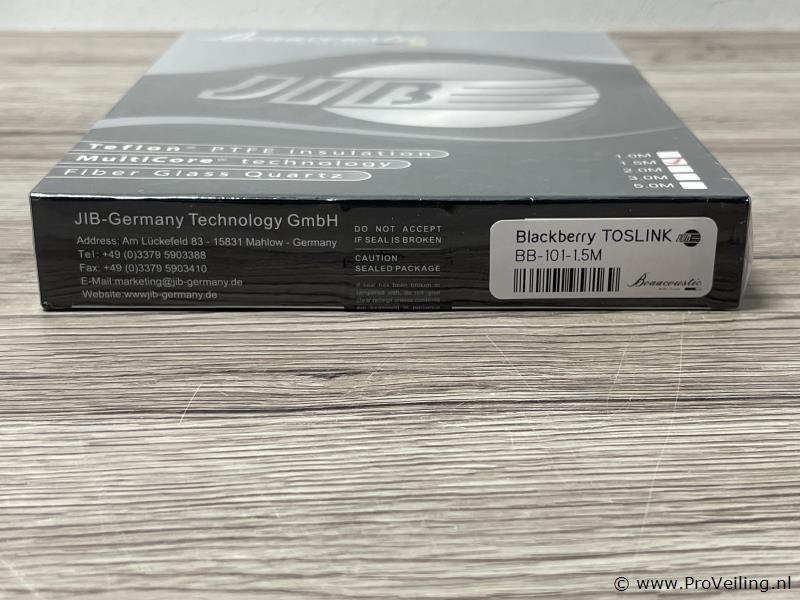 Hi-Fi signaalkabel: merk JIB Boaacoustic; type Blackberry Toslink BB-101-1.5M; nieuw in verpakking; winkelverkoopprijs ca. € 45,-.